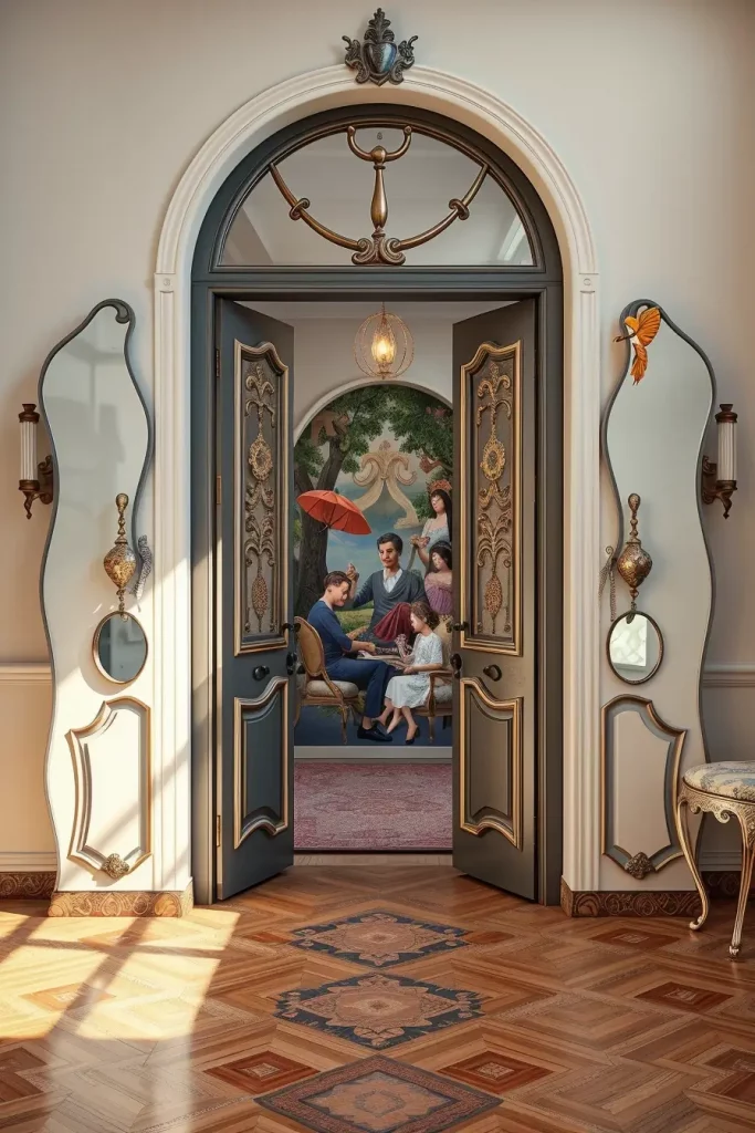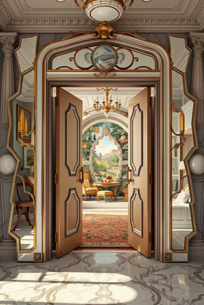 In real design, I would recommend arch or asymmetrical doors, mirrored entryways and frames with abstract motifs. It is possible to add unexpected details such as sculptural knobs or concealed sliding panels to make the entrance resemble entering another world.