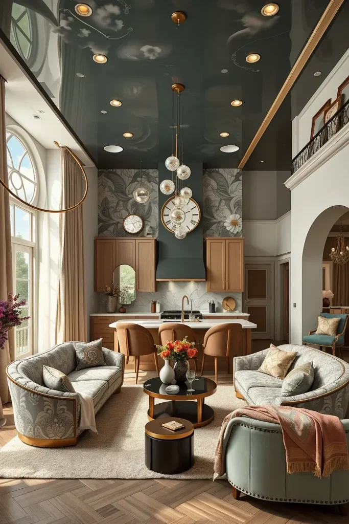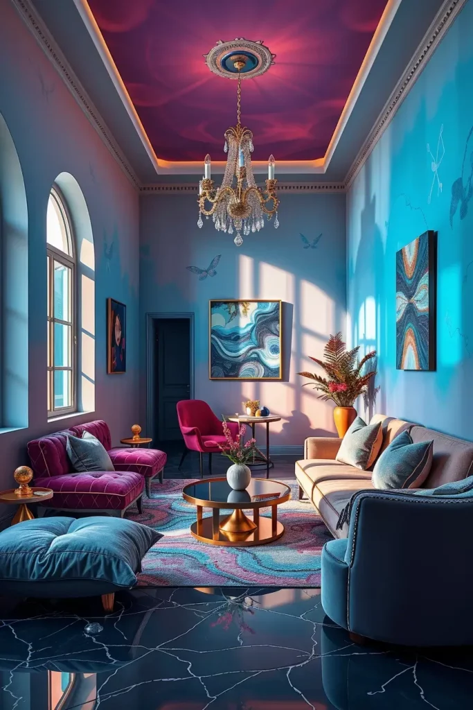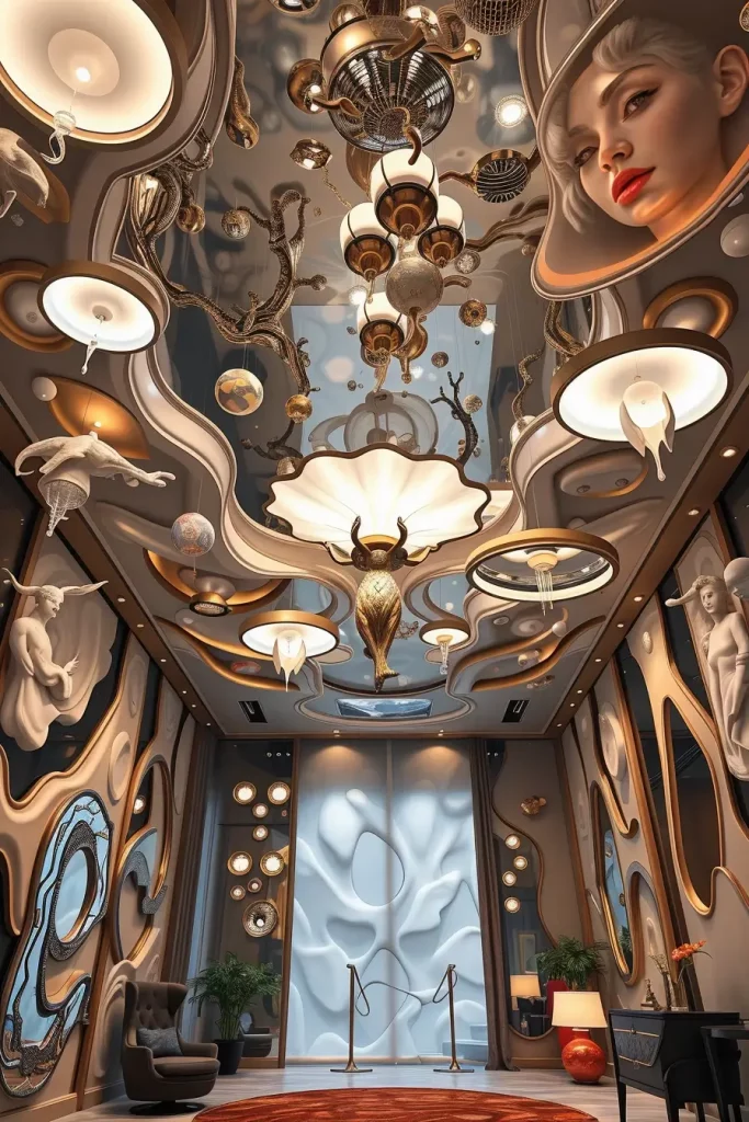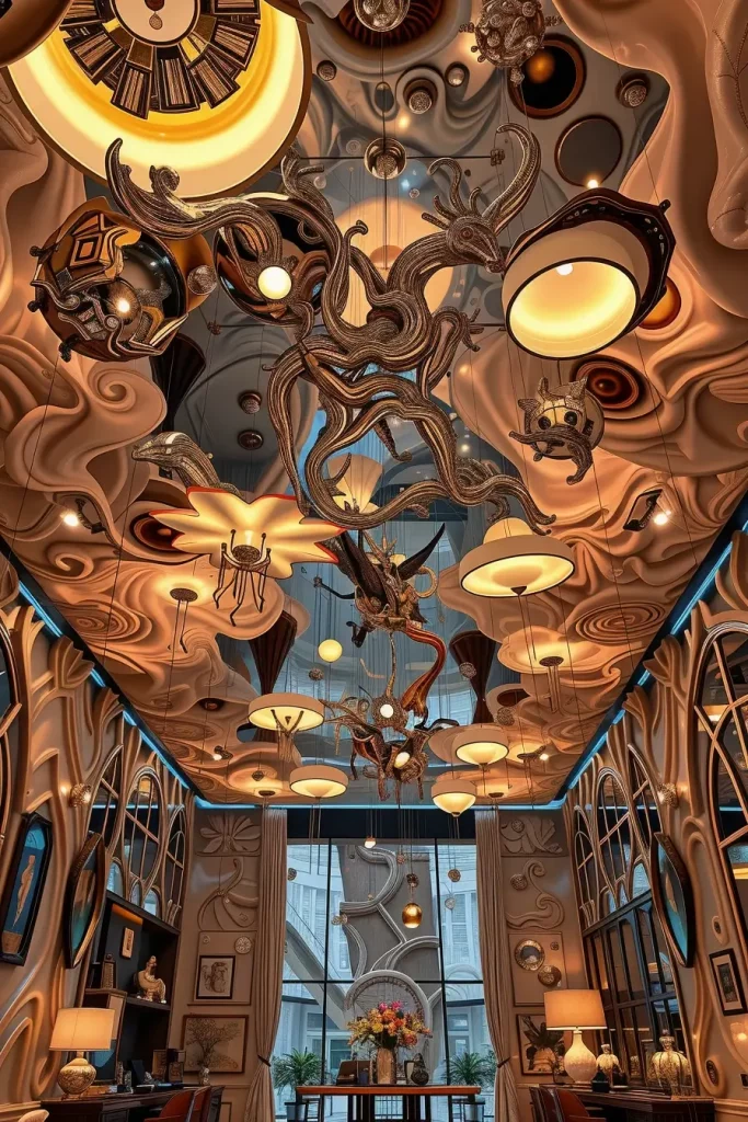 When I think of surrealism, I instantly think of surprise ceilings. A ceiling does not have to be simple- it can play host to sculptural installations, painted illusions, or lighting that seems to be floating in the air. Surrealist ceilings give an impression that gravity has been redesigned and the room is a part of a dream.