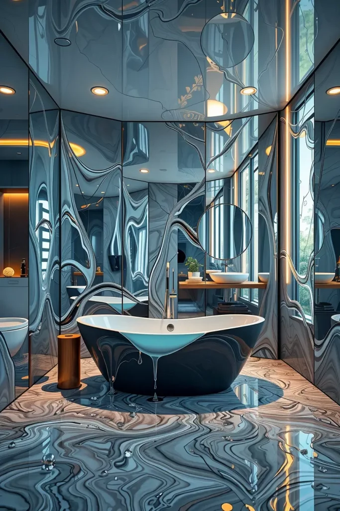 I have always thought that bathrooms are the most appropriate place to do surrealist design since it is a small space where we can break the laws of perception. Consider walls that are covered with mirrored tiles that distort the reflection or flooring with spirals that seem to move as you step. The application of optical play makes a utilitarian space into an immersive one.