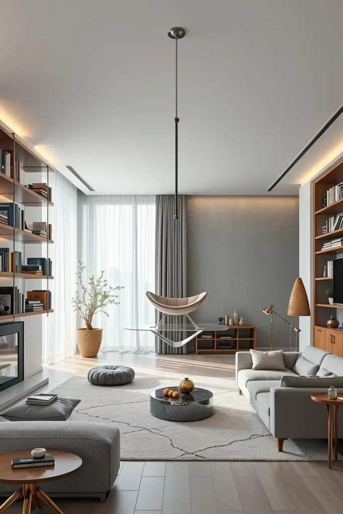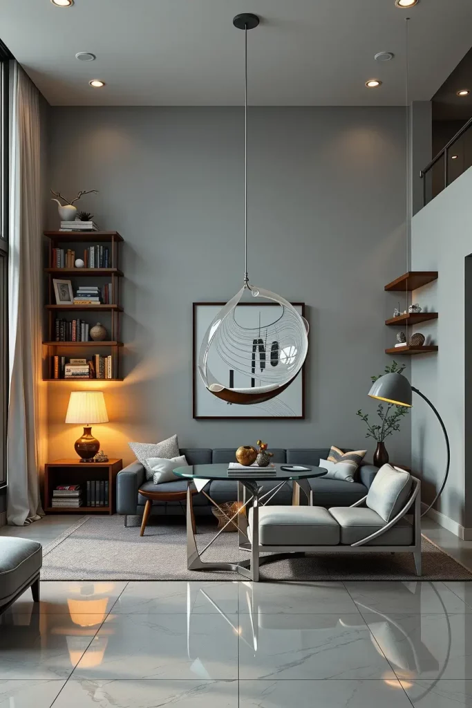 To achieve this, I would advise furniture with transparent bases or wall mounts. Stable support is achieved using clear acrylic supports or hidden brackets to give the illusion of floating. The comfort and surrealist playfulness can also be added by adding lightweight pendant chairs in the living areas.