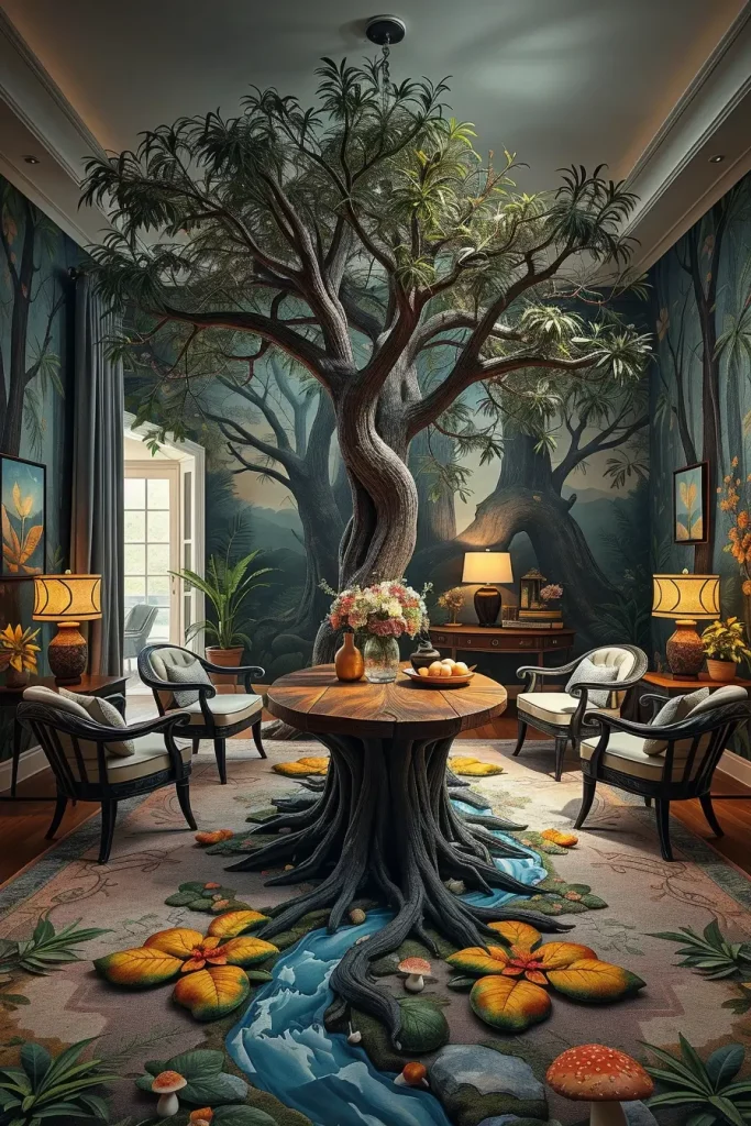 Furniture could be in the form of tree trunk tables or chairs that are covered in vine-like patterns. The natural surrealist theme is supported by accessories like stone sculptures, mushroom-inspired lamps or rugs with patterns resembling flowing rivers. Every decision brings harmony to the organic and unreal.