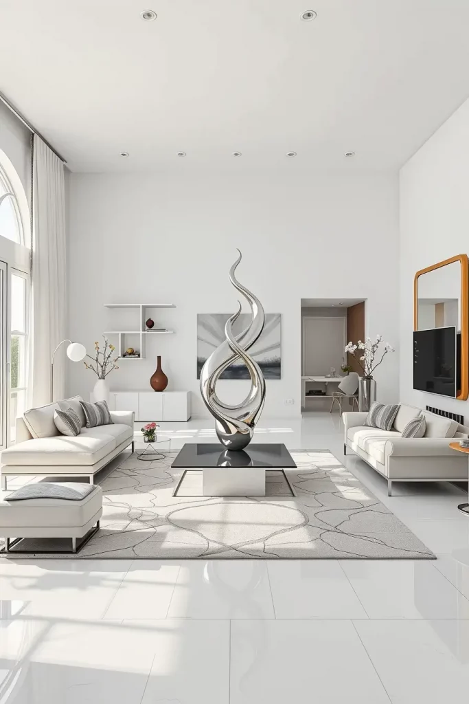 The furniture in such a room must be selected to suit the art work without overshadowing it. A minimalist sofa in muted tones, and an eccentric coffee table, say a coffee table in the shape of an abstract figure, balances out the focus. The accessories such as vases or lamps based on surrealist sculptures also relate the artwork to the general decor.