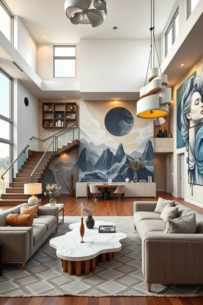 Modern houses are especially well suited to surrealism, since their open design gives them space to experiment. I tend to create contemporary living areas with surrealist inspired feature walls, oversized sculptural lighting or floating staircases that seem to be floating in the air. These touches are bold but right in clean settings.