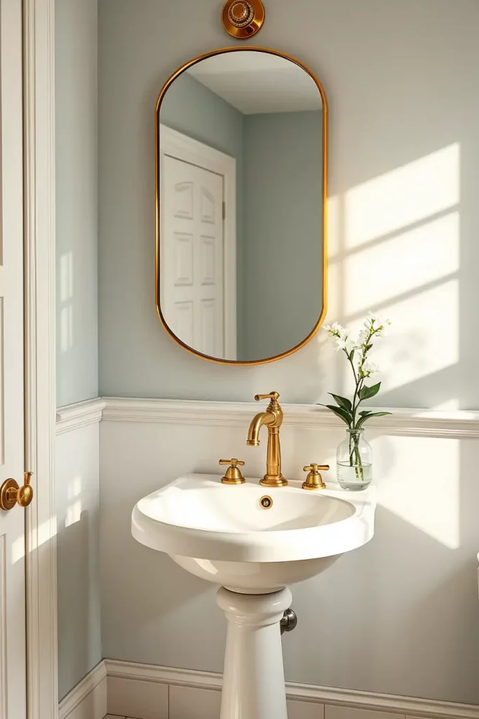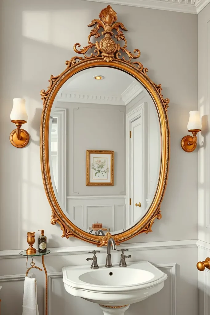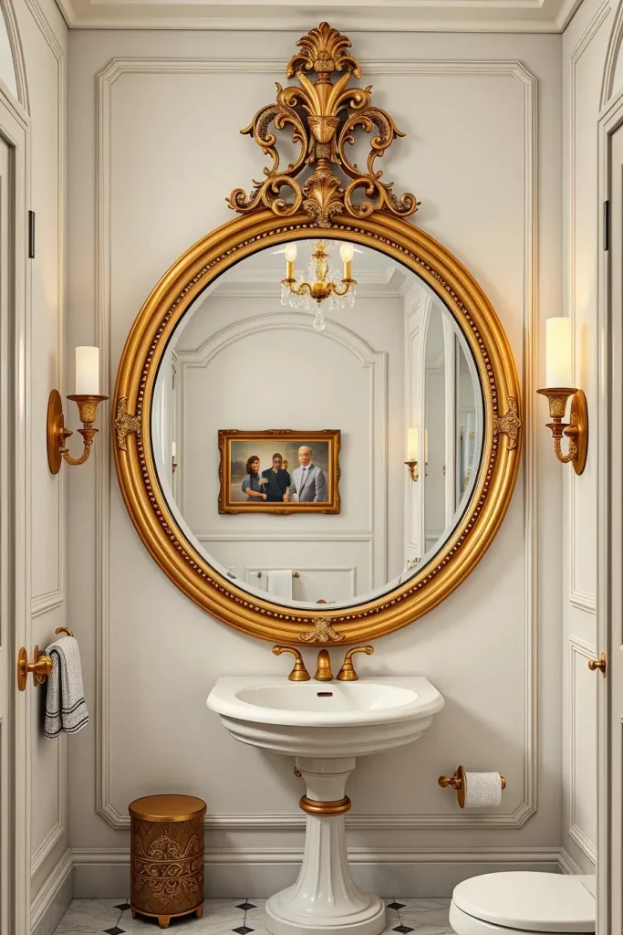 I usually prefer round or arched mirrors with beveled edges or in gold frames. These mirrors are light and characterful when combined with contemporary wall sconces. They also go hand in hand with pedestal sinks, which adds to the general harmony of old and new.