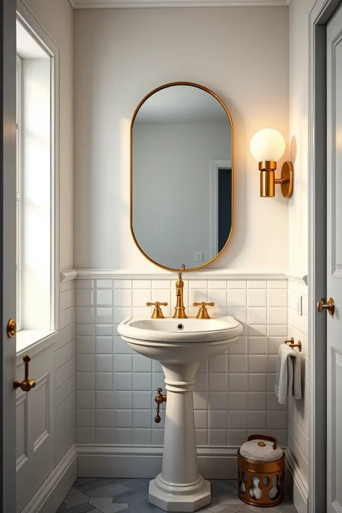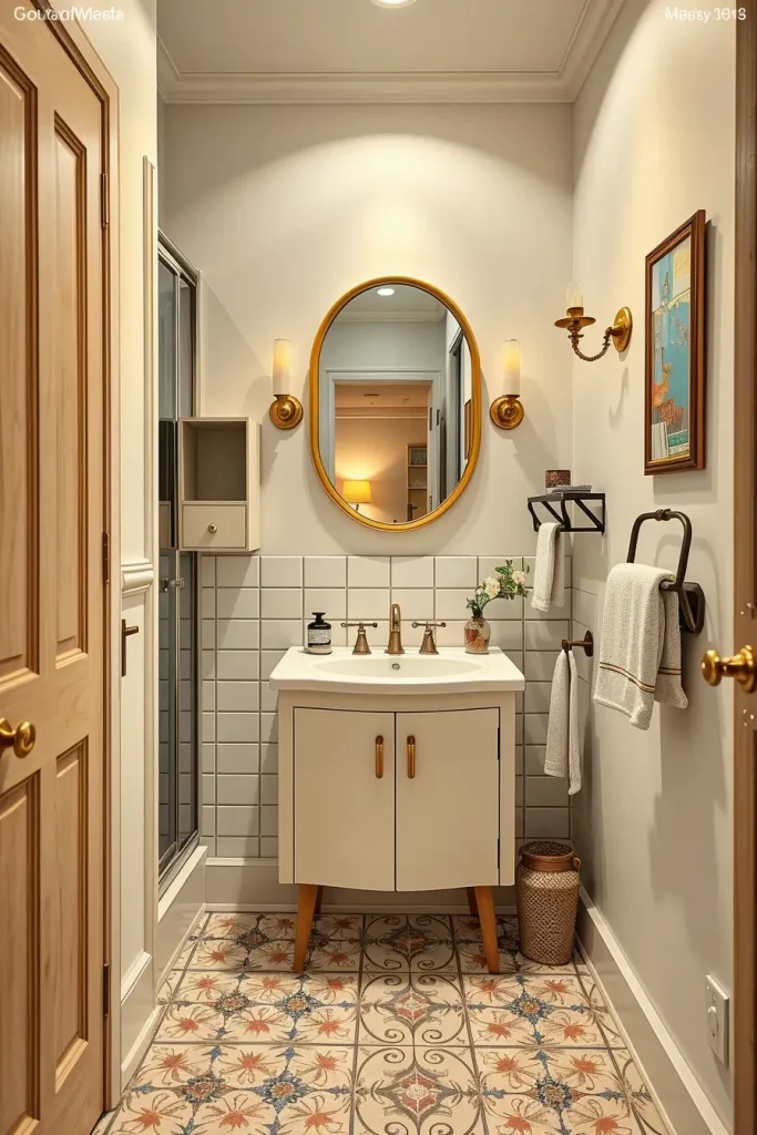 Furniture will include a little pedestal sink or a slim vanity with antique hardware. Cabinets or mirrored medicine cabinets mounted on the walls do not overcrowd the space. The illusion of depth is created by light-colored walls and patterned floor tiles.