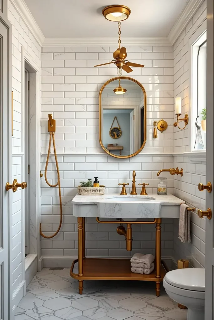 Furniture like a painted deep navy or pale sage vanity can be used with the brass fixtures. Other details like patterned towels or a colorful rug are also a welcome addition to the room without making it look cluttered.