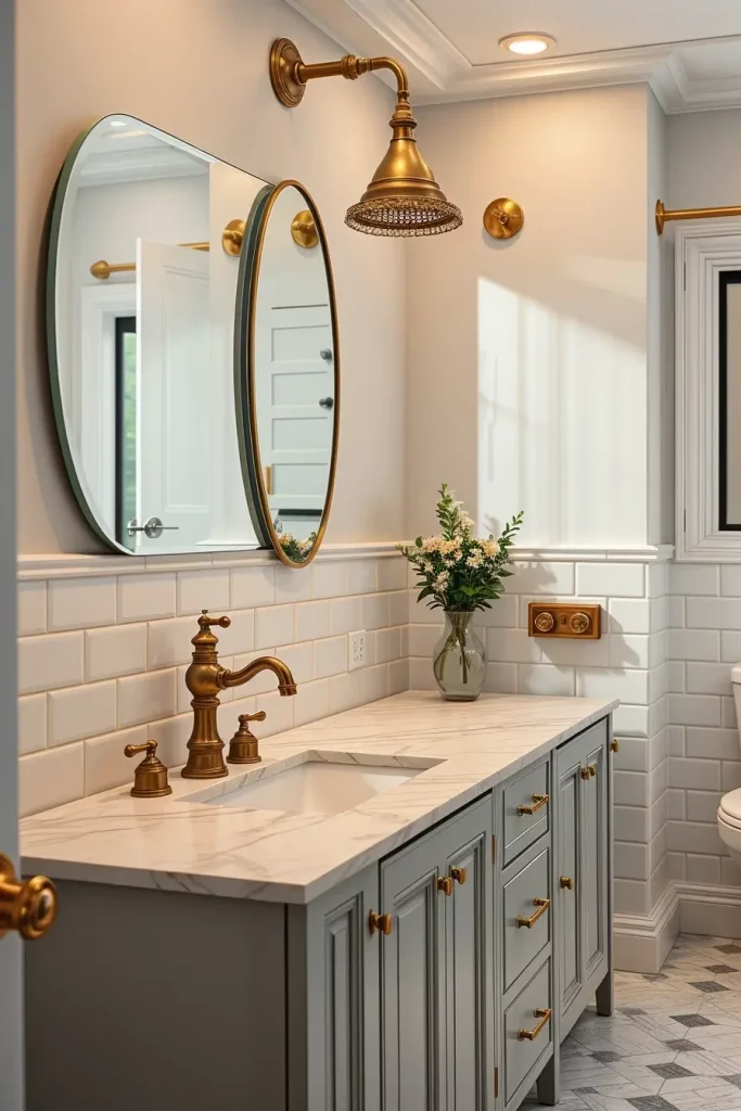 In order to develop a cohesive look, I choose finishes that blend with faucets and hardware-brushed gold or brass lighting with comparable fixtures will form a cohesive look. A chandelier suspended above a freestanding tub is dramatic, and globe sconces by the mirror are soft and functional.