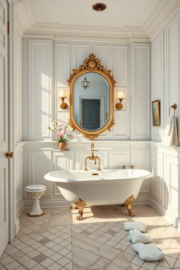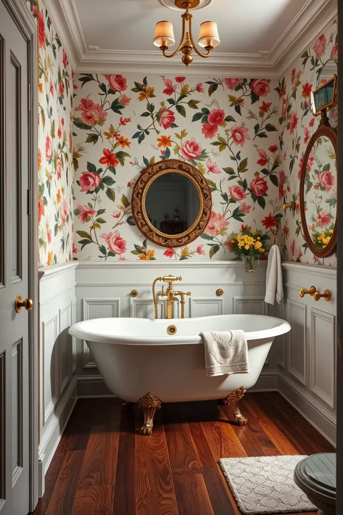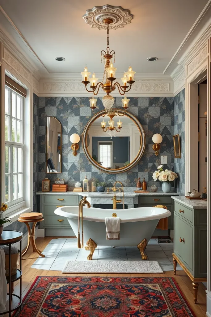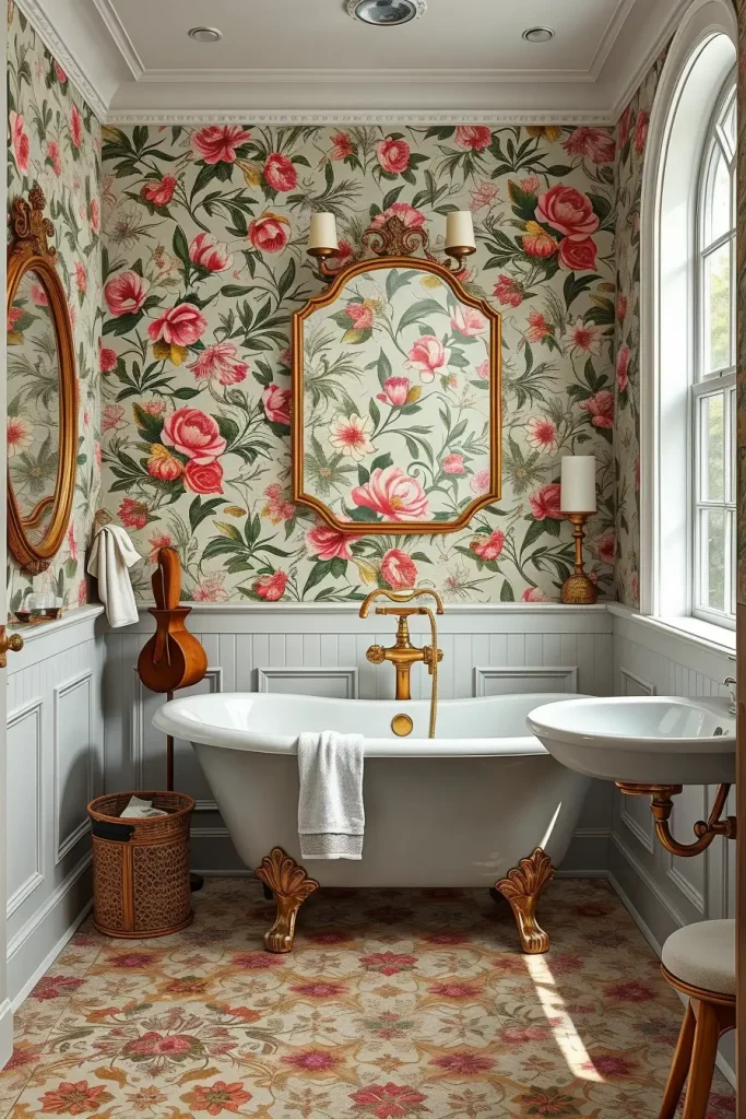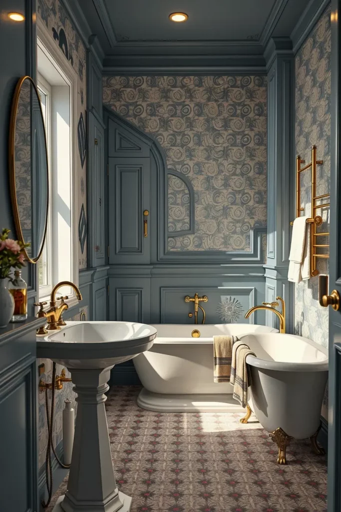 One more thing I would include were bold wallpaper with repeating patterns probably a gold-accented geometric pattern. This makes the old-fashioned look modernized without making the bathroom boring.