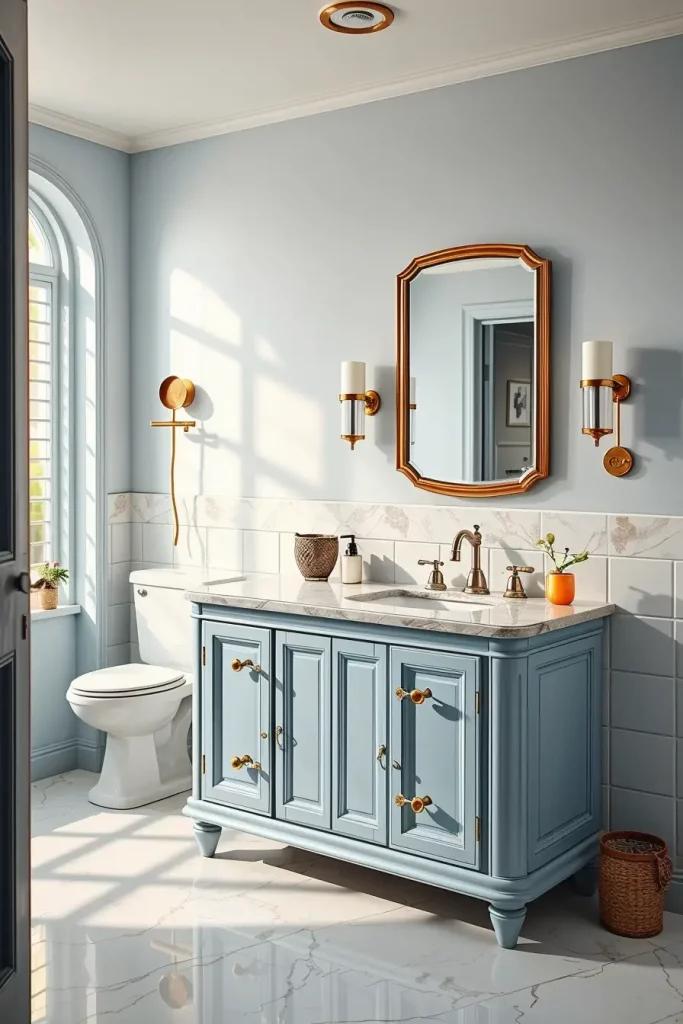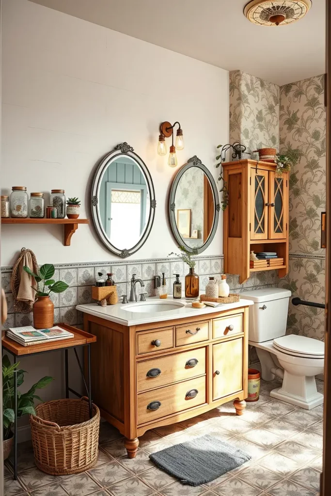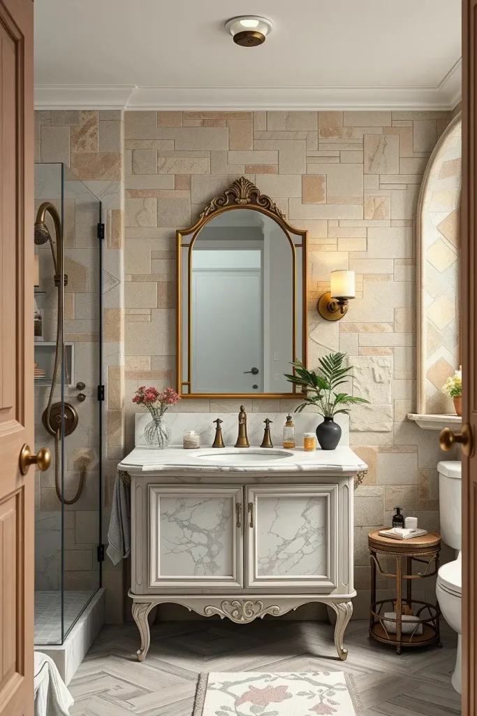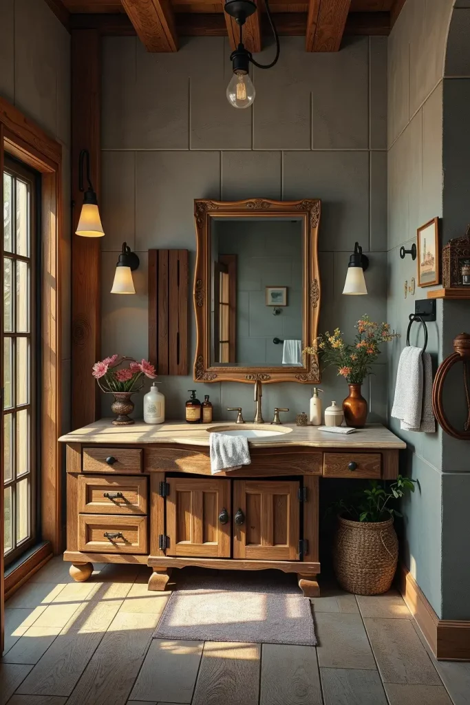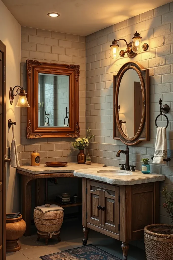 A vintage vanity with retro-style metal hardware is character-creating in the case of furniture. The design is further enhanced by stone countertops which are reused or antique mirrors which have been reworked. I also like using old doors or window frames as creative decorative elements.