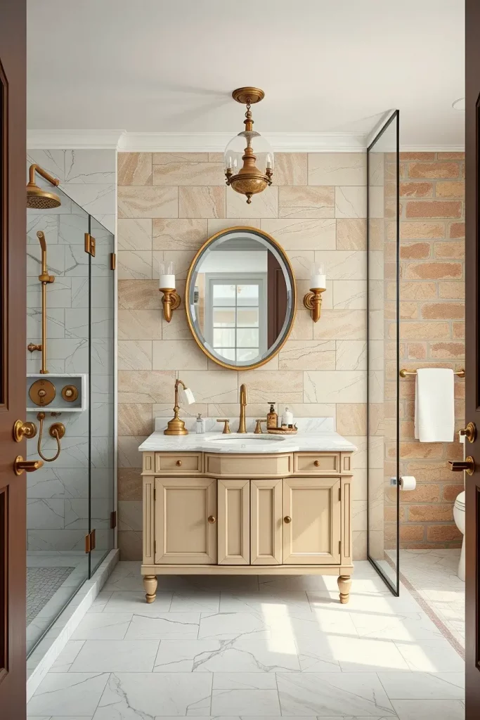 A combination of metals is one of the most thrilling methods to create a modern vintage bathroom. In this way, I can mix the smooth appearance of stainless steel with the comfort of brass or the sophistication of brushed gold. The careful application of finishes gives the bathroom texture and depth, without making it look flat or too homogeneous.