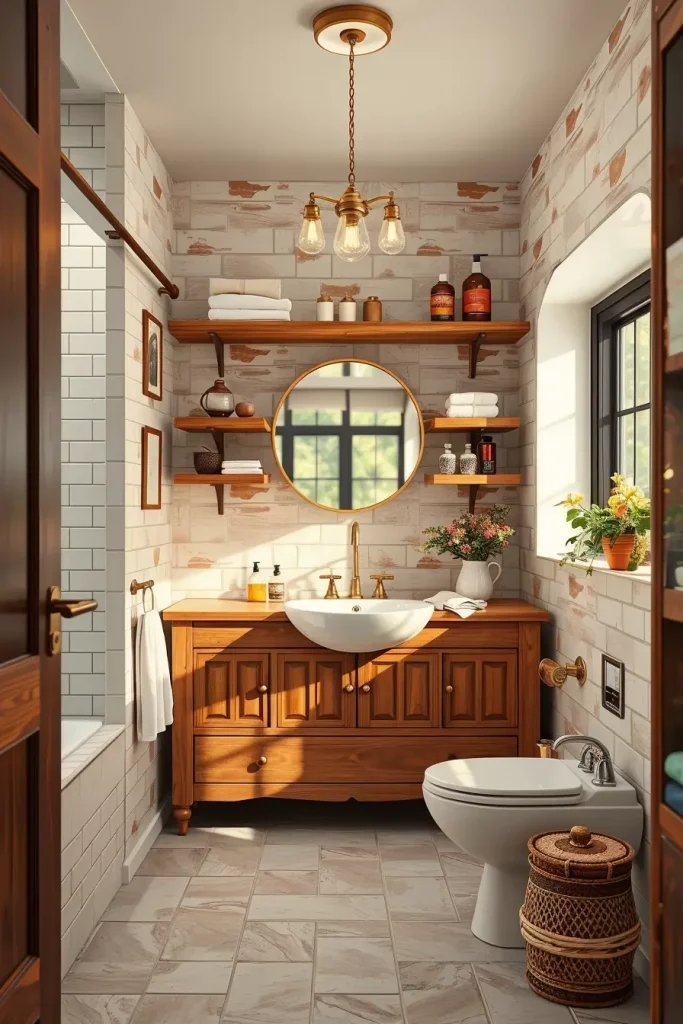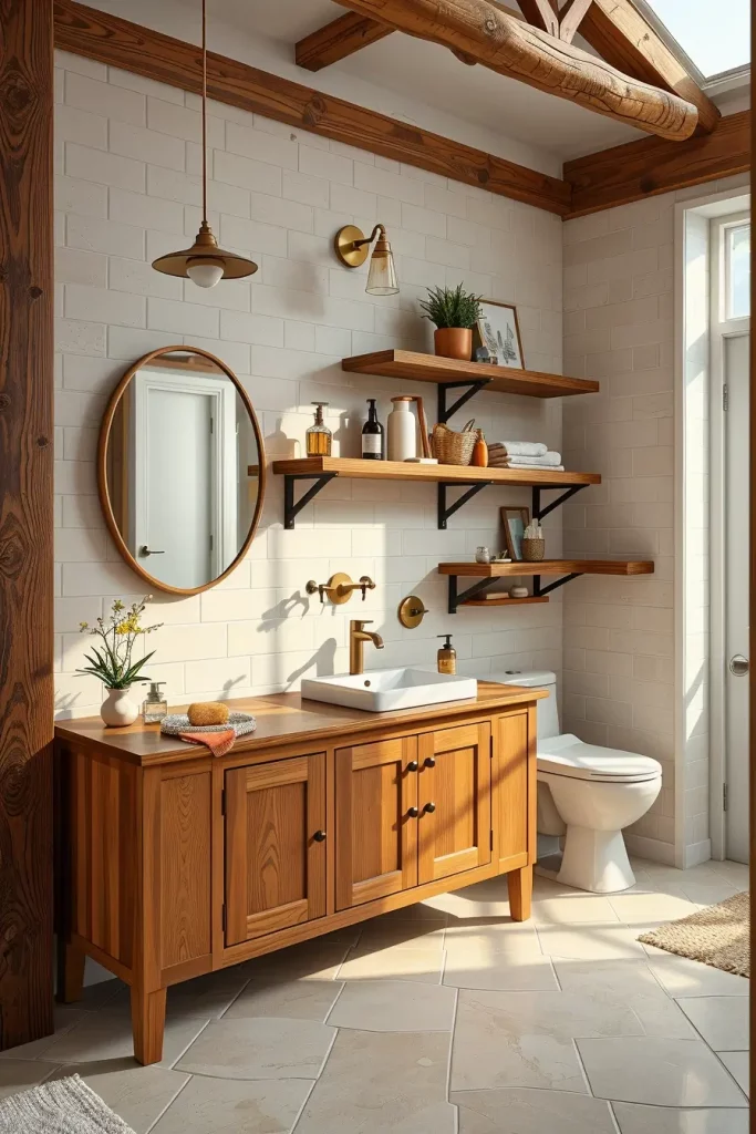 To expand on this, I would use used light lamps or old storage baskets. These little details finish the narrative of authenticity and leave the bathroom functional.