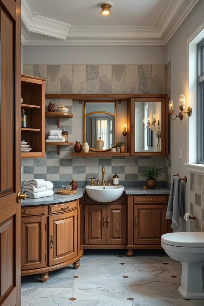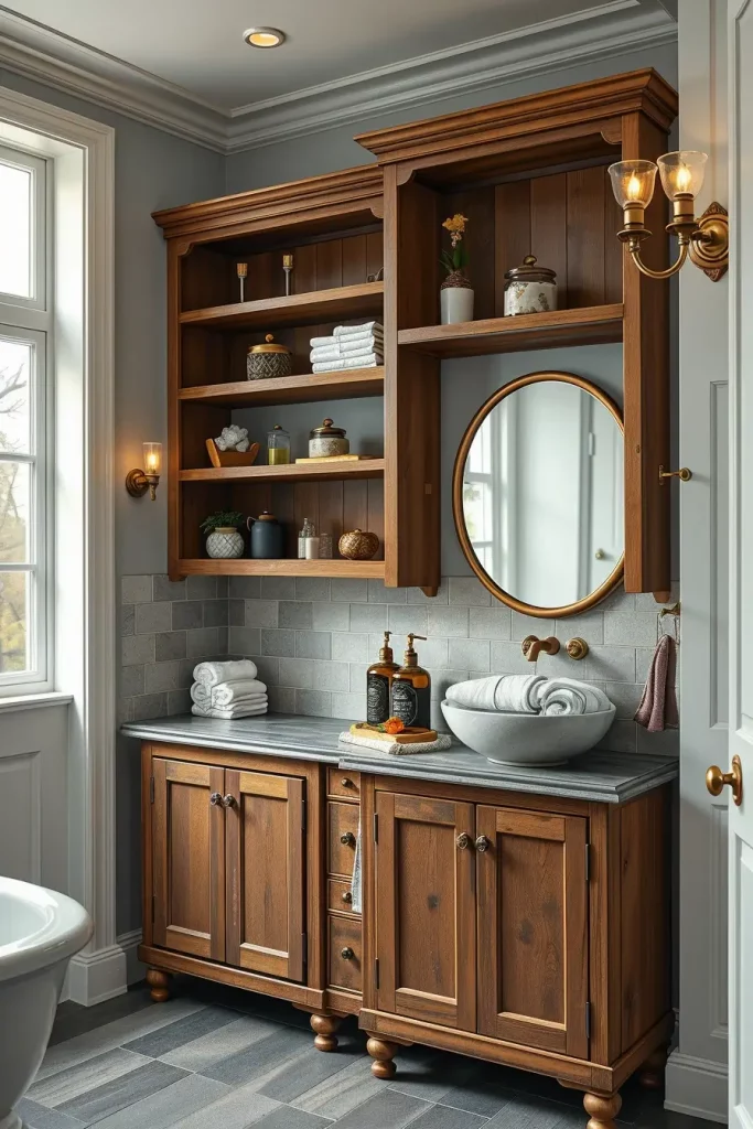 I prefer to combine open shelves and vintage-style closed cabinets when I am designing storage in a modern vintage bathroom. Open shelves enable the display of daily necessities such as towels or decorative jars that bring character and softness. In the meantime, the old cabinets with beautiful decoration or old handles provide hidden storage, which does not affect the functionality.
