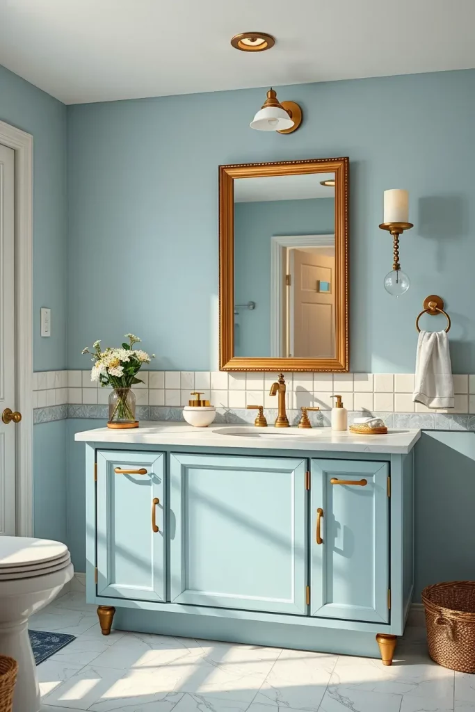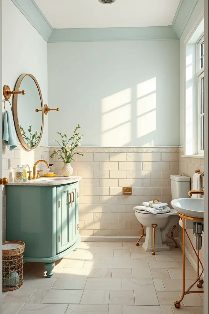 In furniture, I would like to combine pastel-colored vanities or accent cabinets with neutral flooring and white tiles. Light fixtures, pastel towels, and bath mats add to the color story. The palette is enhanced with gold or brass hardware.