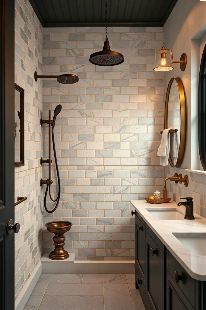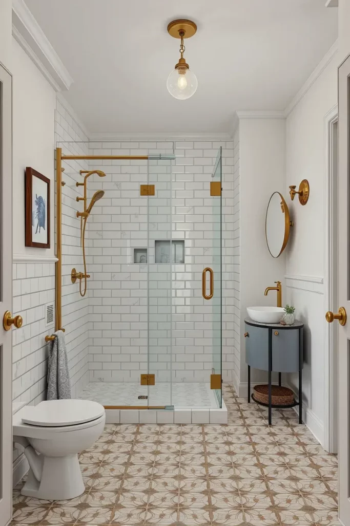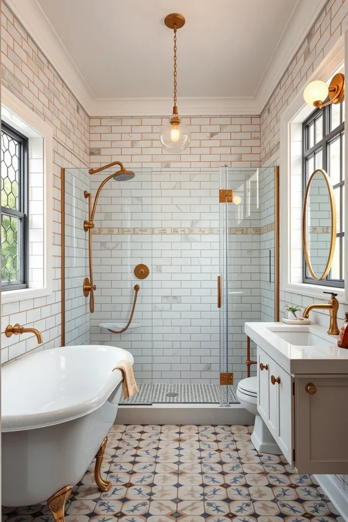 I am fond of combining a smooth frameless shower stall with subway tiles or patterned floors. It has a traditional brass showerhead and cross-handle faucets that make it look nostalgic. This combination renders the shower modern without losing the touch with the vintage design.