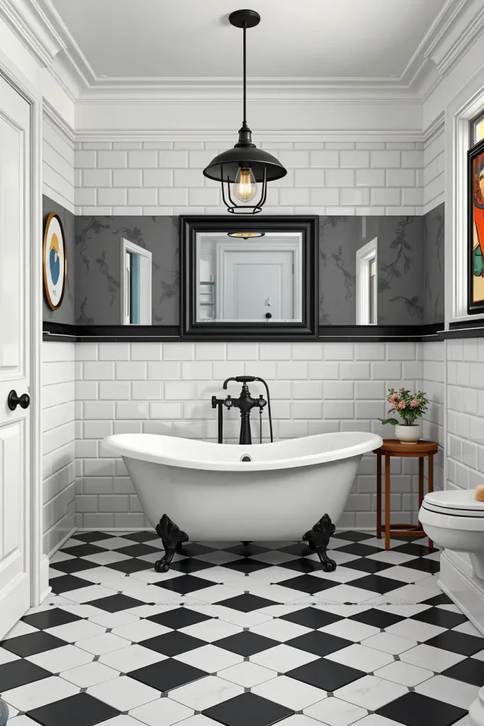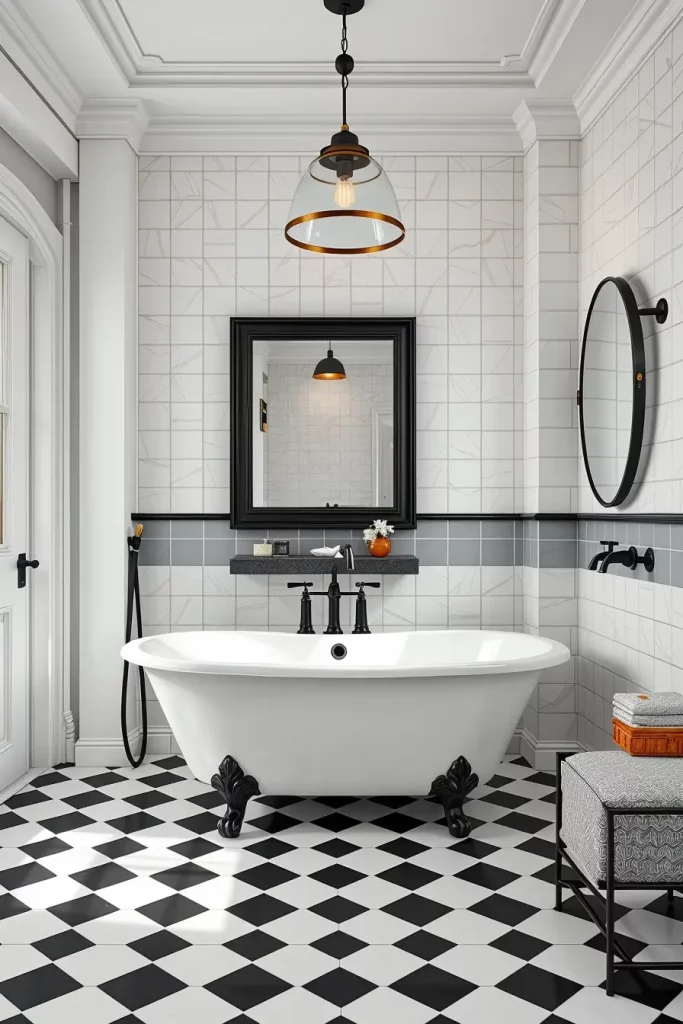 A black-and-white design of the bathroom is one of the most prominent ways to blend modern and vintage. This contrast instantly introduces drama and sophistication to the room and makes it feel organized and ancient. To achieve this appearance, I prefer floor tiles in black and white in checkerboard or geometric patterns.