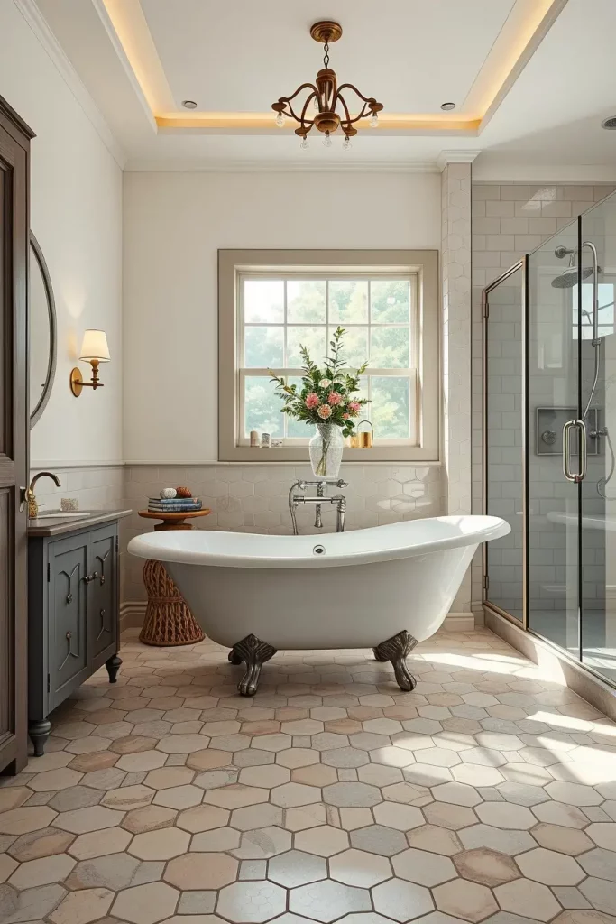 An old and new can be complemented by a clawfoot bathtub with a minimal glass shower or hexagonal floor tiles with smooth cabinetry. These classic combinations bring some life to the interior.