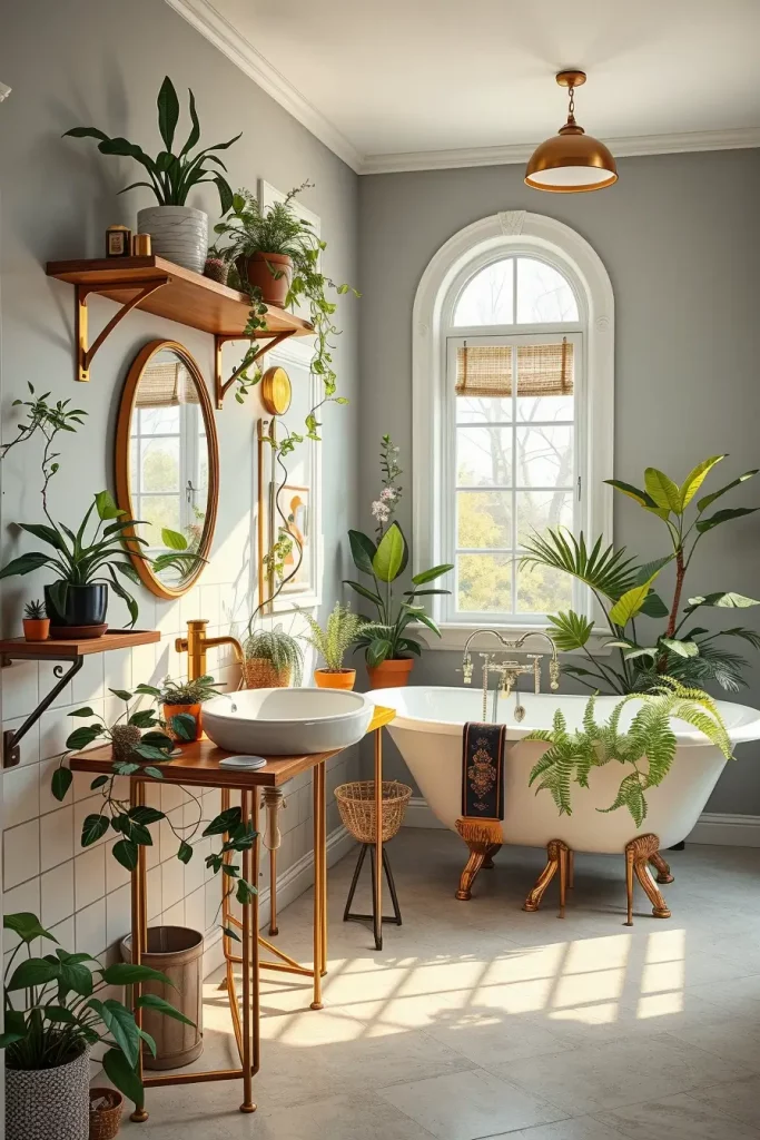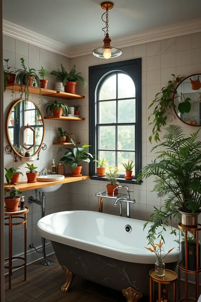 In the case of furniture and decor, I prefer to have small potted plants on an open shelf or greenery placed near windows. Ferns or palms will fit in a freestanding tub. Planters that are vintage, like ceramic pots or stands made of brass, are an additional detail that fits the theme.