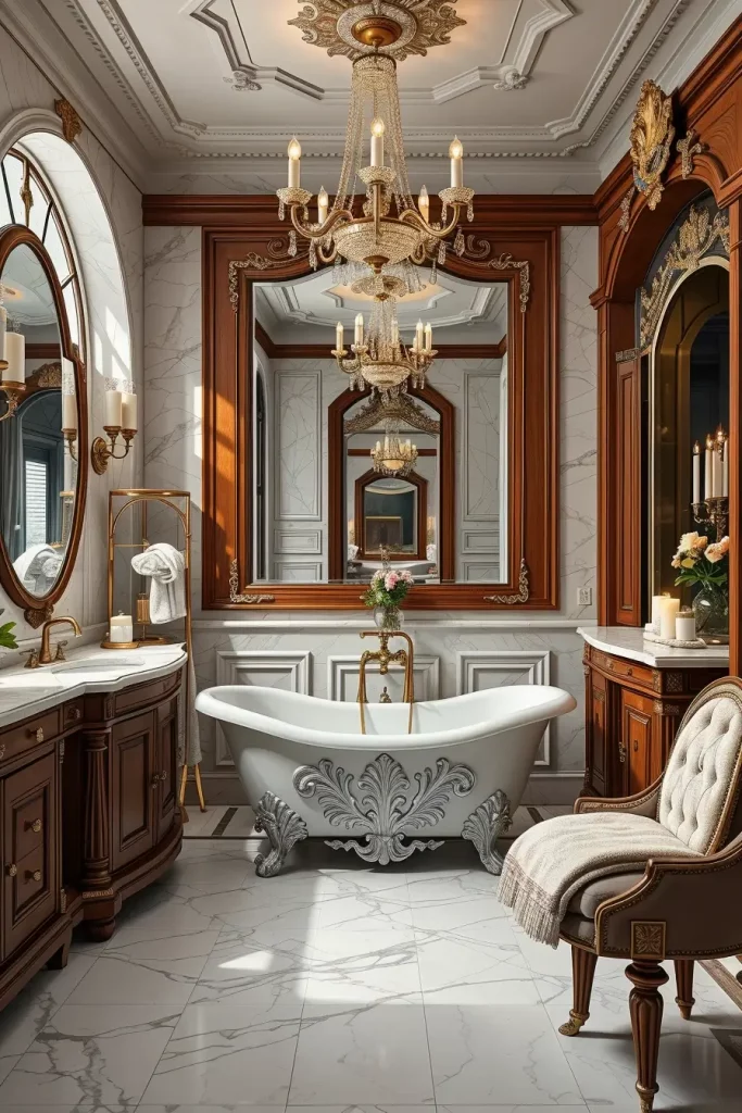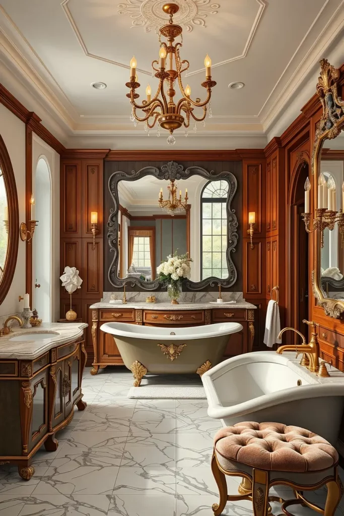 I have a few of my favorite luxury details, such as freestanding tubs with elaborate decoration, statement lighting, and large mirrors with carved wooden or gilded frames. Everything has a role, both practical and decorative, and it adds to a general impression of elegance. Even the softest textile like plush towels or velvet stools can contribute to the appearance.