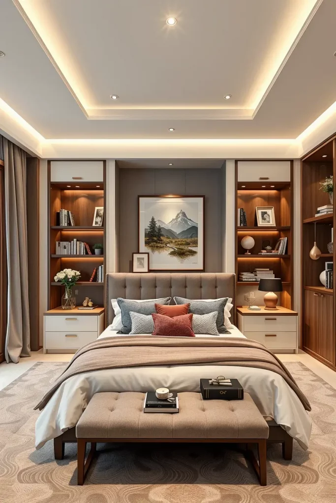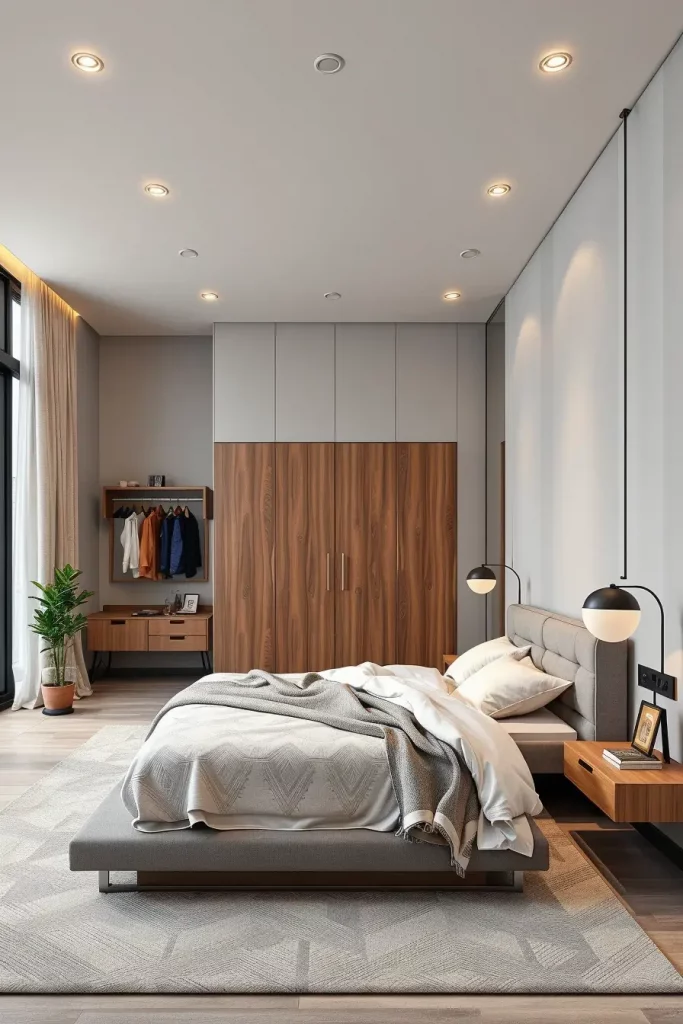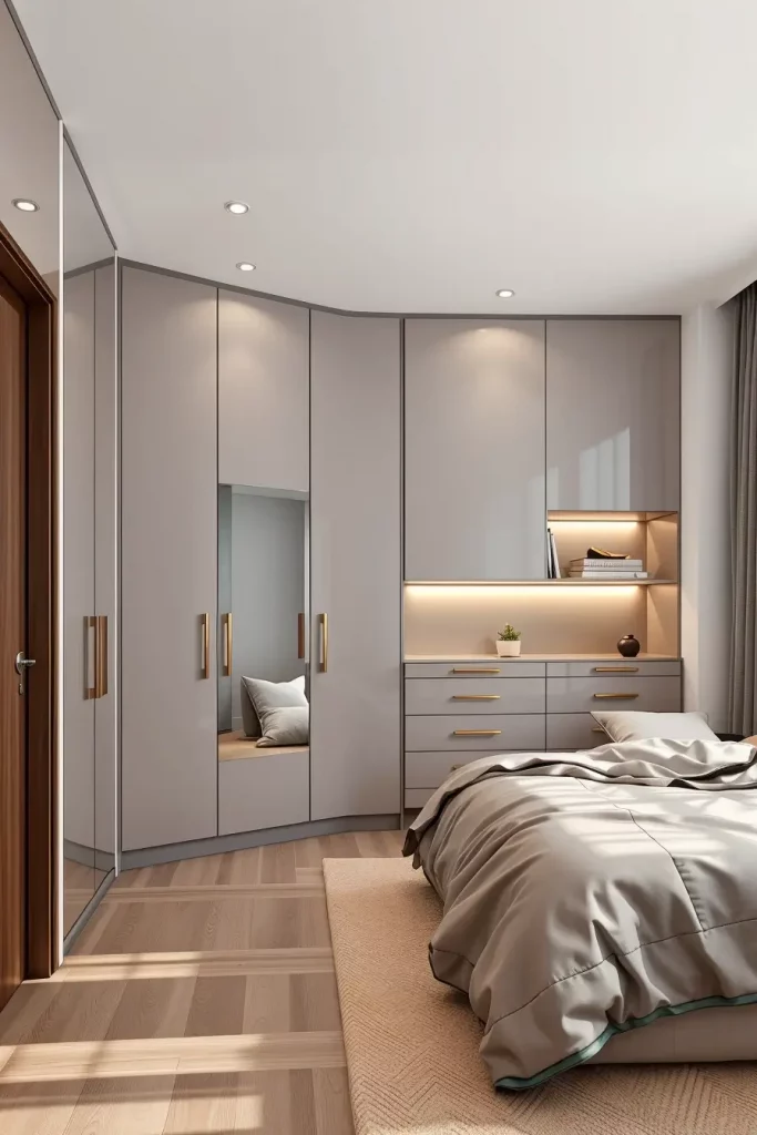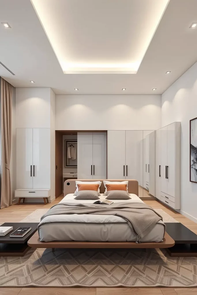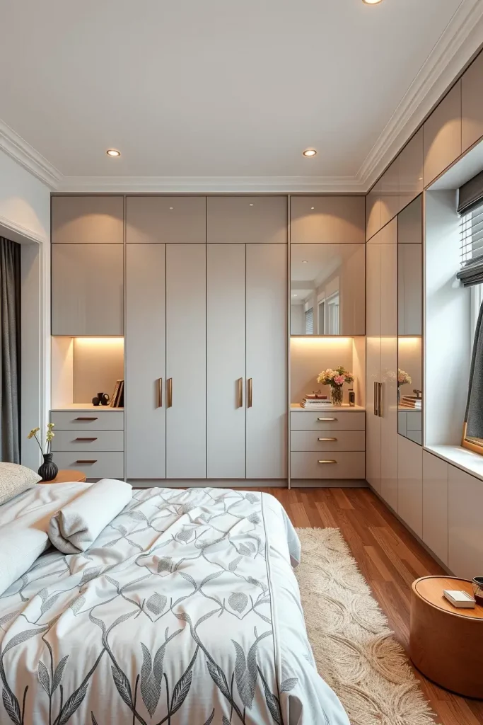 I choose the built-in units carefully, including the units that have flush doors, handle-free mechanism, and similar wall finishes. Such options minimize the visual noise and promote a minimalist aesthetic and the greatest possible storage area. The use of integrated lighting in the wardrobes is also functional, and does not introduce any noise to the decoration.