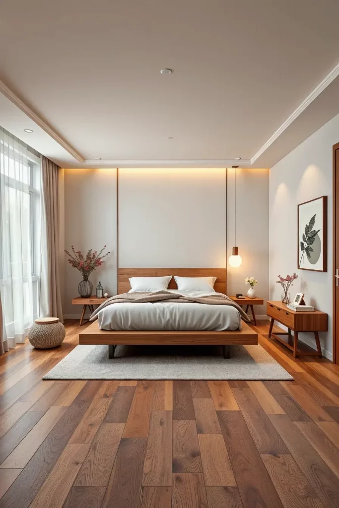In my experience as a professional, the flooring must be visually grounding the room with the aid of furniture placement and mobility. The low-contrast wood colors are a better match with the upholstered beds, floating nightstands, and built-in lighting. Matte finishes are also common advice that I give since they also minimize the glare and contribute to the relaxing ambiance that a bedroom setting requires.