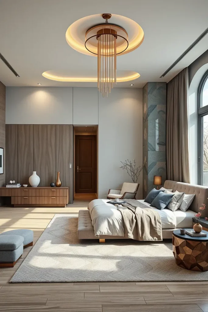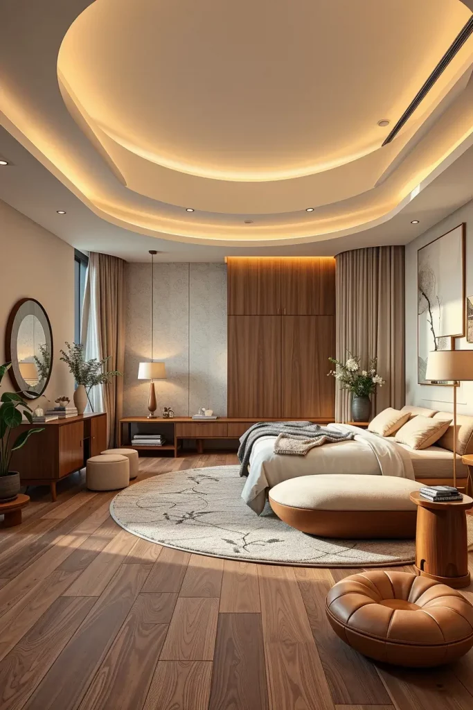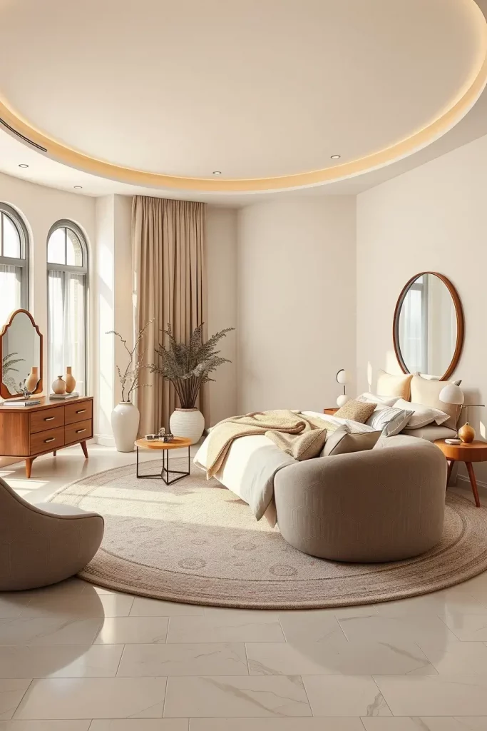 The main elements in this approach are furniture that has rounded edges, curvy headboards, and oval rugs. I additionally combine the arched niches and gently shaped lighting fixtures as a way of strengthening visual harmony in the room.