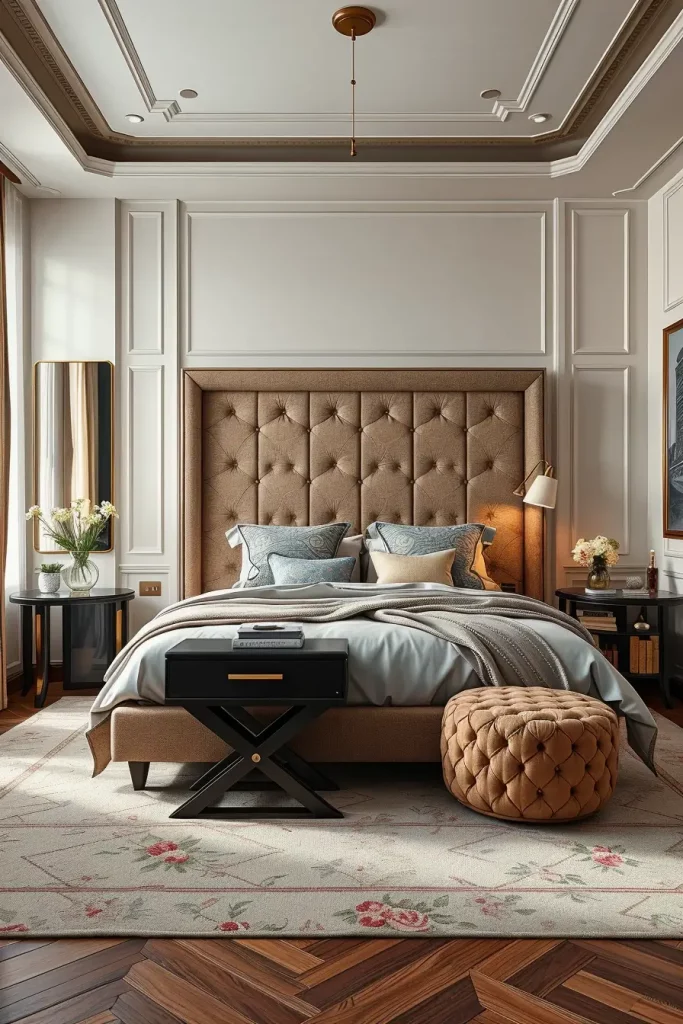 A statement bed can have a bright headbed, built-in lights or unique upholstery. I would suggest using material that is the texture and material that is substantial e.g. the textured fabric or structured pad. The bed frame must be stable enough to be perceived as stable as well as comfortable.