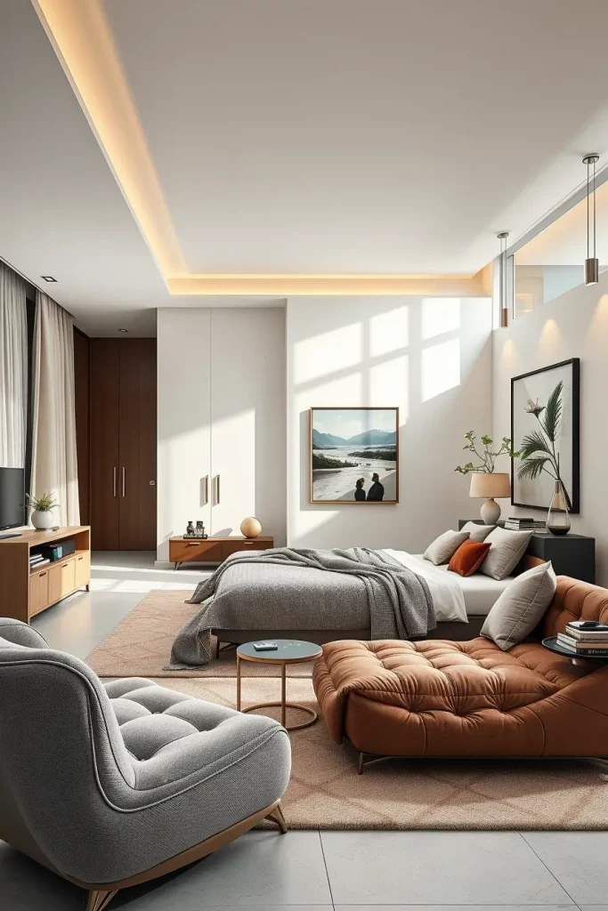 Every piece of furniture is evident in the interior. I am more focused on low-profile beds, minimalistic wardrobes, and floating nightstands that make the space physically smaller. Upholstered surfaces make the appearance softer, and matte finishes and slight curves also make it elegant. I would always suggest such furniture that incorporates storage in a discrete manner that does not interfere with the functionality of rooms but rather enhances the modern look of the room.