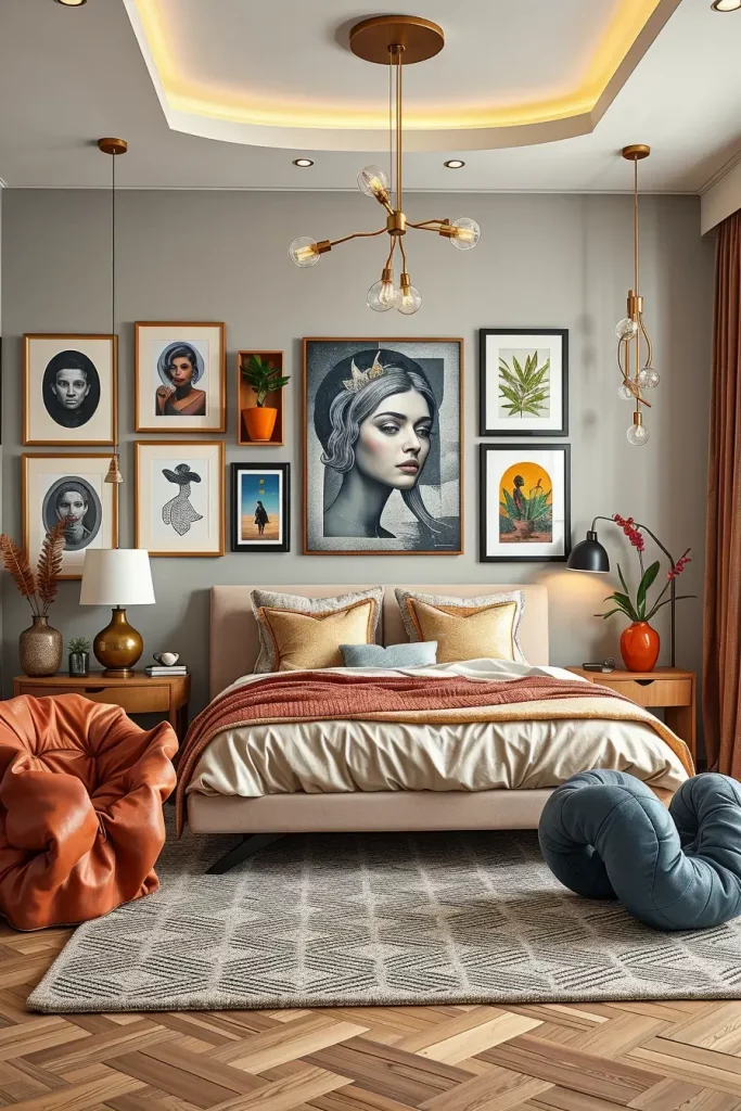 Furniture and decor are usually bold-shaped, customized art, and statement lighting. I use gallery style walls, sculptural pieces of furniture and rough surfaces to stimulate creativity without overcrowding the space.