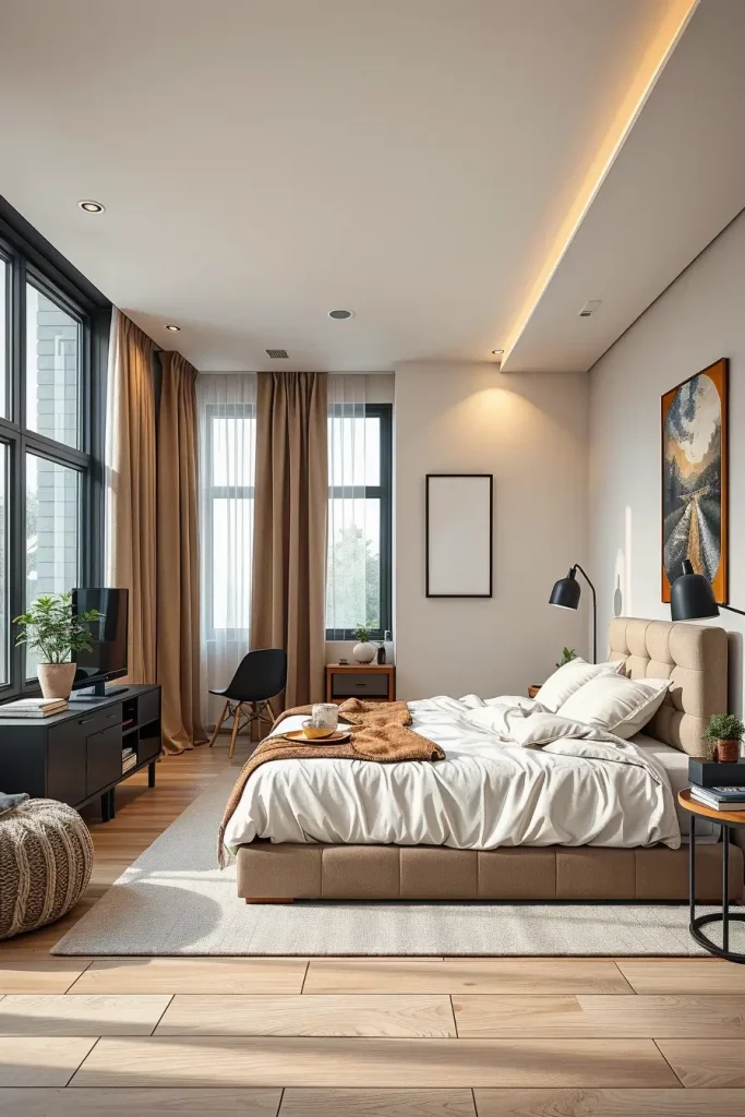 Furniture and layout wise, I suggest that the forms should be clean and the proportions should be deliberate. Comfortable neutral-coloured bed furnishing can be used to create a low-profile bed that gives an opportunity to feature bold colours on the wall, whereas sleek nightstands and inbuilt storage keep the visual environment in order. I usually add an accent chair, bench (minimalist) or modular wardrobes in the same color story. Multiple lighting, such as recessed lights in the ceiling and the use of soft bedside lamps, has made the colors comfortable at any time of the day.