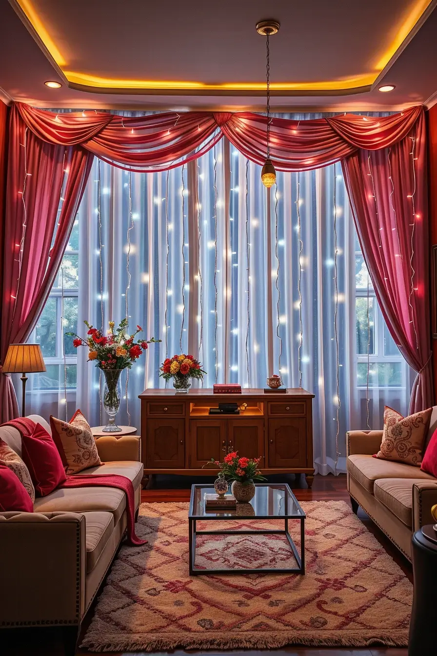 My window decorations tend to be enclosed in red and white alternating strands. Indoors, I would combine them with thin curtains or roman shades in neutral tones to make the light more diffused. An adjoining armchair topped with a red throw blanket forms a homey nook that is quite festive but fairly functional.
