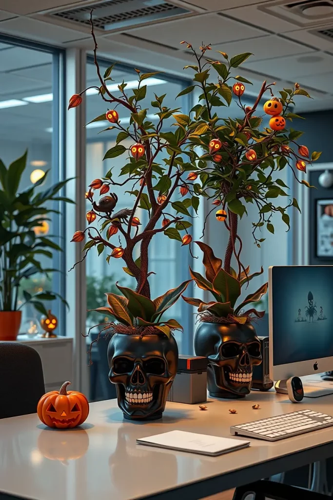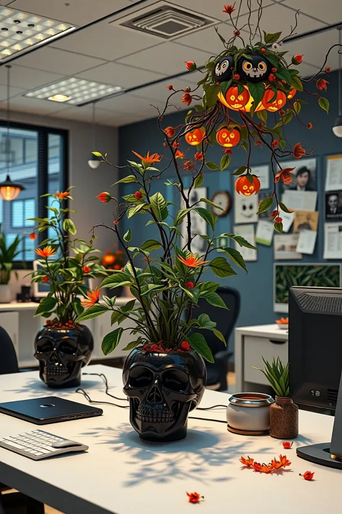 Halloween decoration with creepy office plants is an original and amusing idea. I have created pots and planters with small animatronic action- shaking leaves, moving vines, or eyeballs that pop open when you move. This is excellent in open plan or around desks.