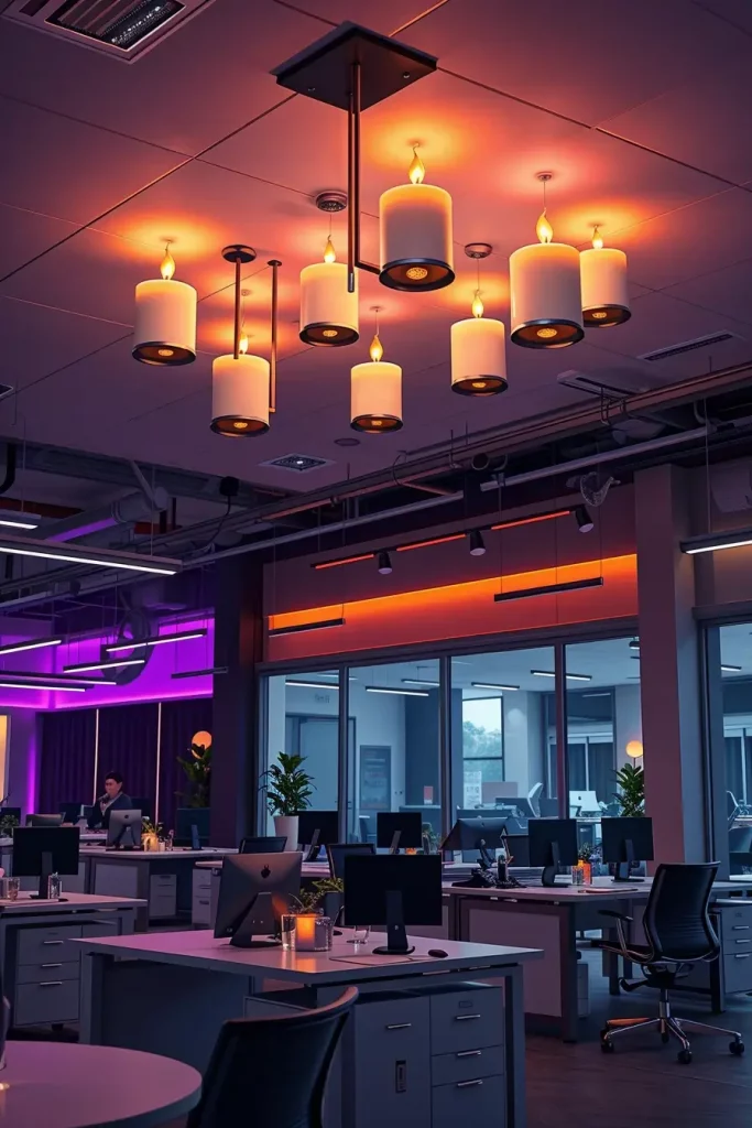 To make it visually the most effective, I put dozens of flameless candles of different heights around workstations and incorporated timed flickers using smart lighting applications. I also added recessed lights that had filters in orange and violet to create the effect of spectral movement. This arrangement is effective in both big open-offices and small cubes and the shadows created by it shift as individuals move.