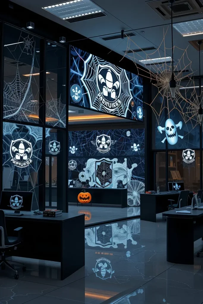 This may be achieved through simple graphics updates on the shared screens or light panels. I’ve placed vinyl stickers on glass doors and windows showing distorted versions of the company’s name with blood drips or jack-o’-lanterns hiding in the text. In case your office has motion-activated signage, it is possible to add a jump-scare animation or a dark variant of the welcome screen to provide a memorable scare to the guests.