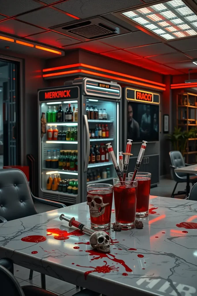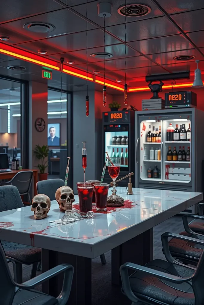 A breakroom is one of my favorite places where the transformation occurs. In the case of frightening Halloween office decorations, I redecorated our kitchen lounge entirely by red-and-green LED backlighting, black tablecloths and a blood buffet. The drink stations were horror-themed, with such options as Witchs Brew punch, glowing slime soda, and syringes of cranberry juice.