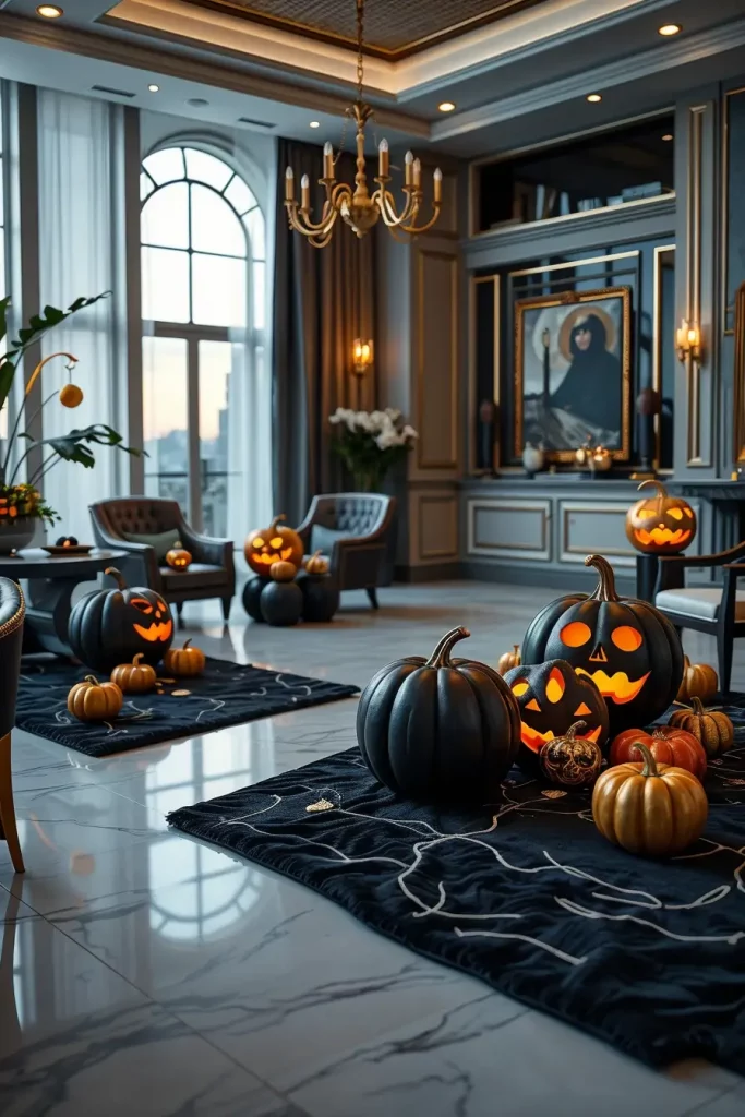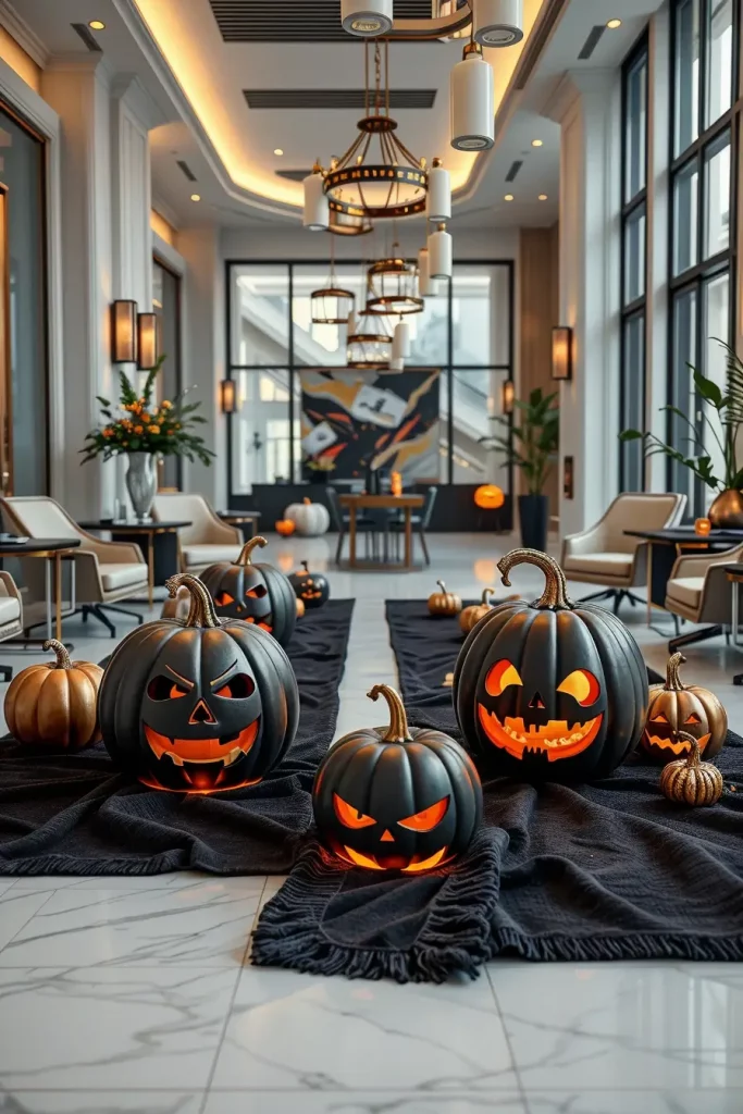 No more ordinary pumpkins, 2025 is the year of sophisticated Halloween pumpkin designs that are scary at the same time. I have painted black, matte-finished gourds and carved them into spooky but classy faces and placed gold leaf around the stems. These were clustered together with velvet cloth at the bottom, along glass counters and reception desks.