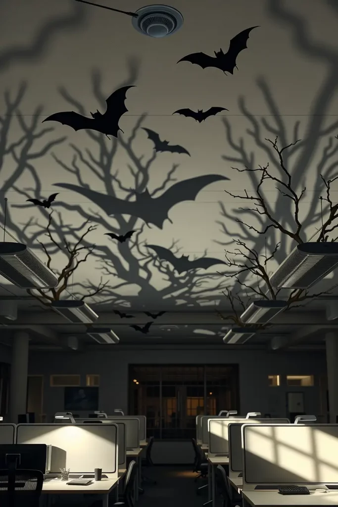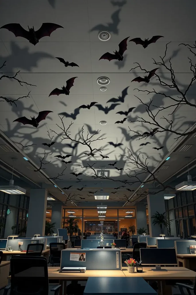 Ceiling decor with motion makes it appear alive. I put up projectors on wheels that projected slow moving shadows of bats, zombies and haunted trees. These shadows moved along the walls and floors making our office look like a haunted forest.