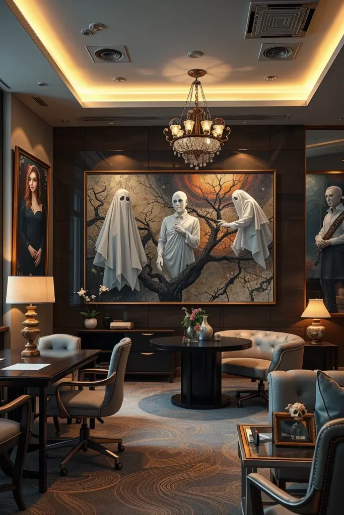 Artworks are usually not considered in Halloween decor, but in 2025, I turned all the paintings and frames in the office into something creepy and strange. I put sheer black veils on top of contemporary canvases, used removable overlays to turn abstract portraits into ghostly silhouettes, and flickering lights behind picture frames to create an illusion of motion.