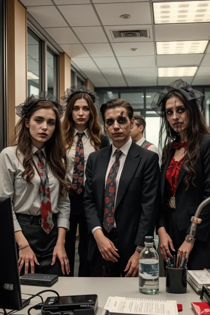 I even organized a themed photo shoot in the office foyer including props and backdrops. Others dressed up in Victorian mourning dresses, others as zombie CEOs, one as a haunted professor with cobwebbed glasses and bone jewelry. The formula was: mix frightening details with otherwise business appearances.