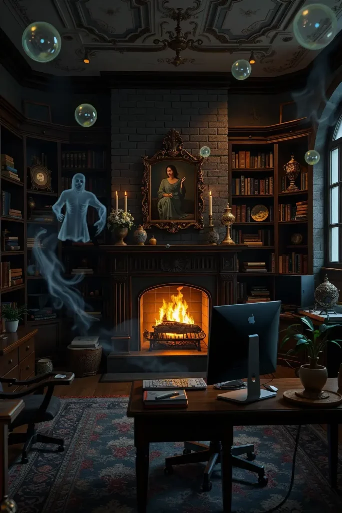 Zoom and Teams are a regular thing in hybrid offices- so I designed paranormal backgrounds that gave a spooky feel to every call. My set was a flickering fireplace, books that open themselves, and floating orbs. Others employed graveyard mist, haunted office halls, or moving shadow figures in the distance.