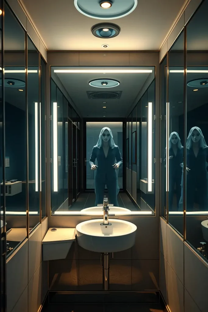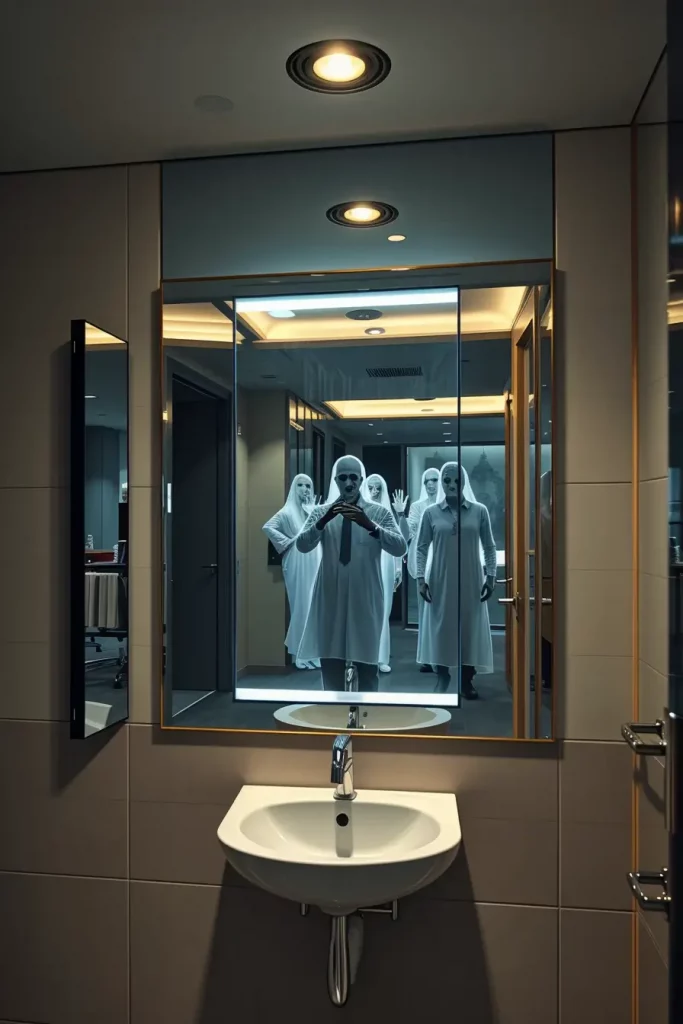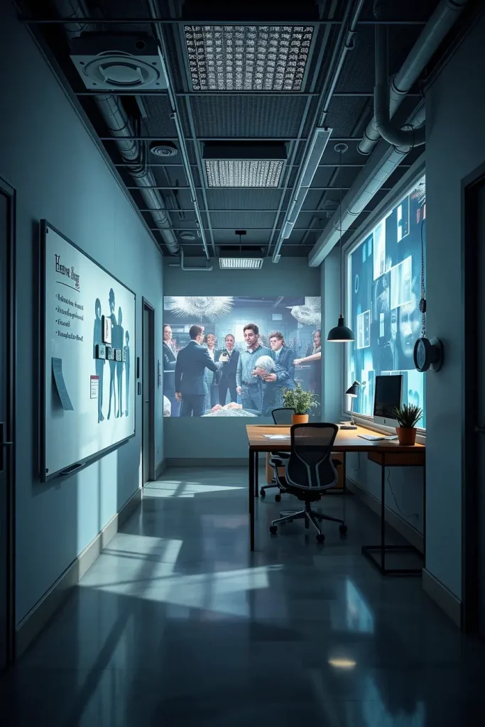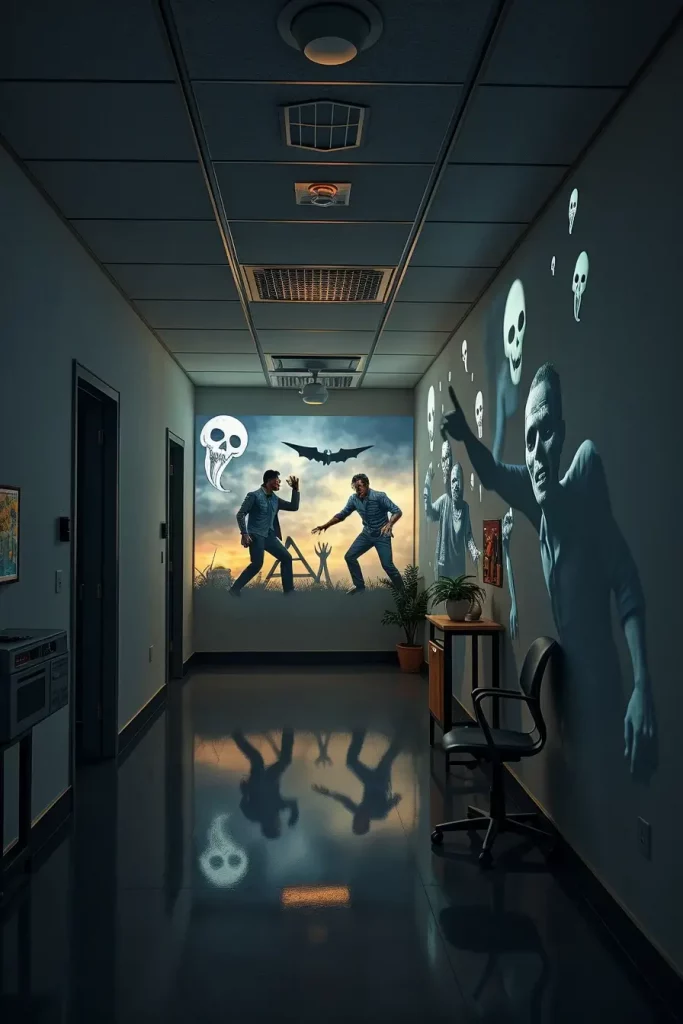 Digital mirror hauntings are a new favorite in technologically advanced office environments and provide an immersive AR experience. I prefer to install smart mirrors in the bathroom, in the elevator lobby, or near coffee points. These mirrors show creepy overlays shadowy figures behind you, glowing red eyes or shifting facial features, activated when a person looks into the mirror.
