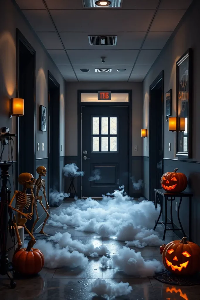 There is no substitute to that initial impression. In our primary hallway entrance, I had dry ice cauldrons behind safety grates that produced low and curling fog. Paired with black lighting, skeleton sentries, and flickering jack-o’-lanterns, the effect was theatrical and intimidating. This Halloween office entrance design amazed all the people who entered the building.