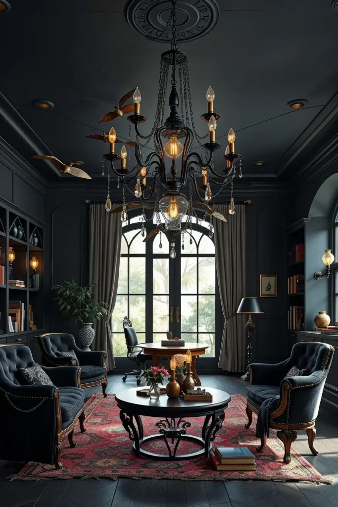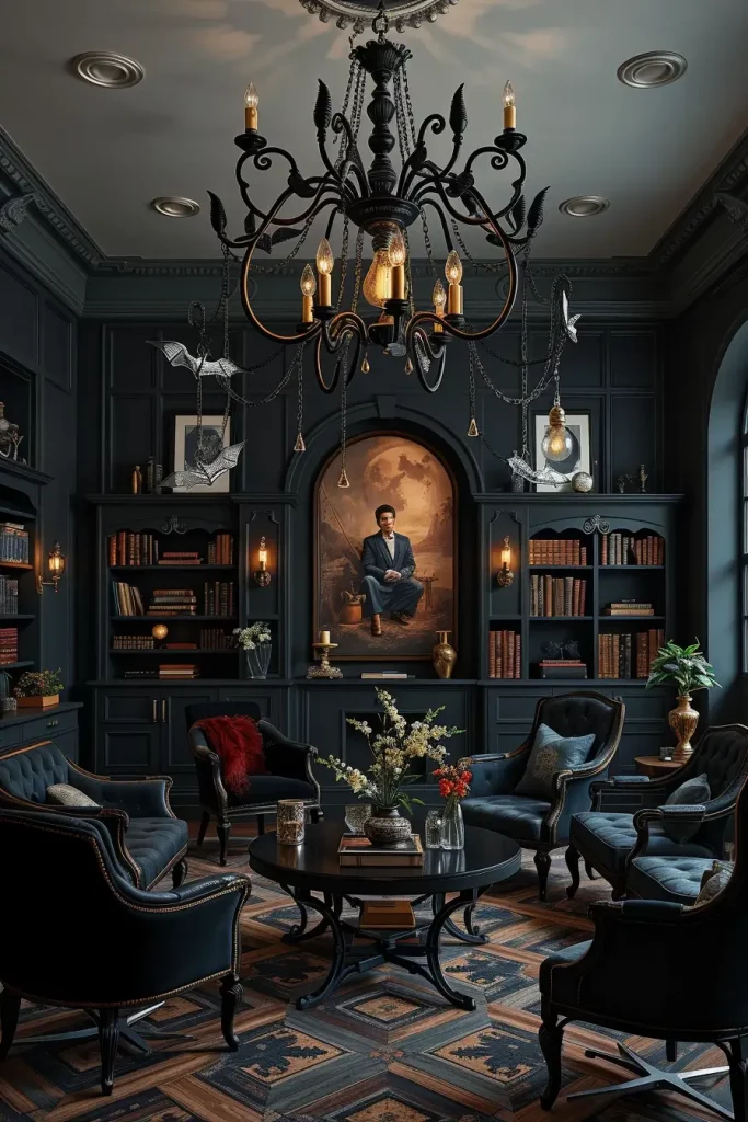 To achieve this appearance, I applied heavy matte black chandeliers decorated with black iron chains and rubber bats hanging at different lengths. I put in smoke-gray Edison bulbs to give the place a more haunted light. The creepy gothic atmosphere was also enhanced by the surrounding furniture, black velvet chairs, wrought-iron coffee tables, and vintage books. These chandeliers are most effective when they are hung in high ceiling rooms where they have space to dominate.