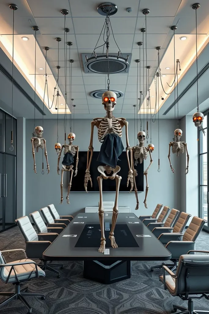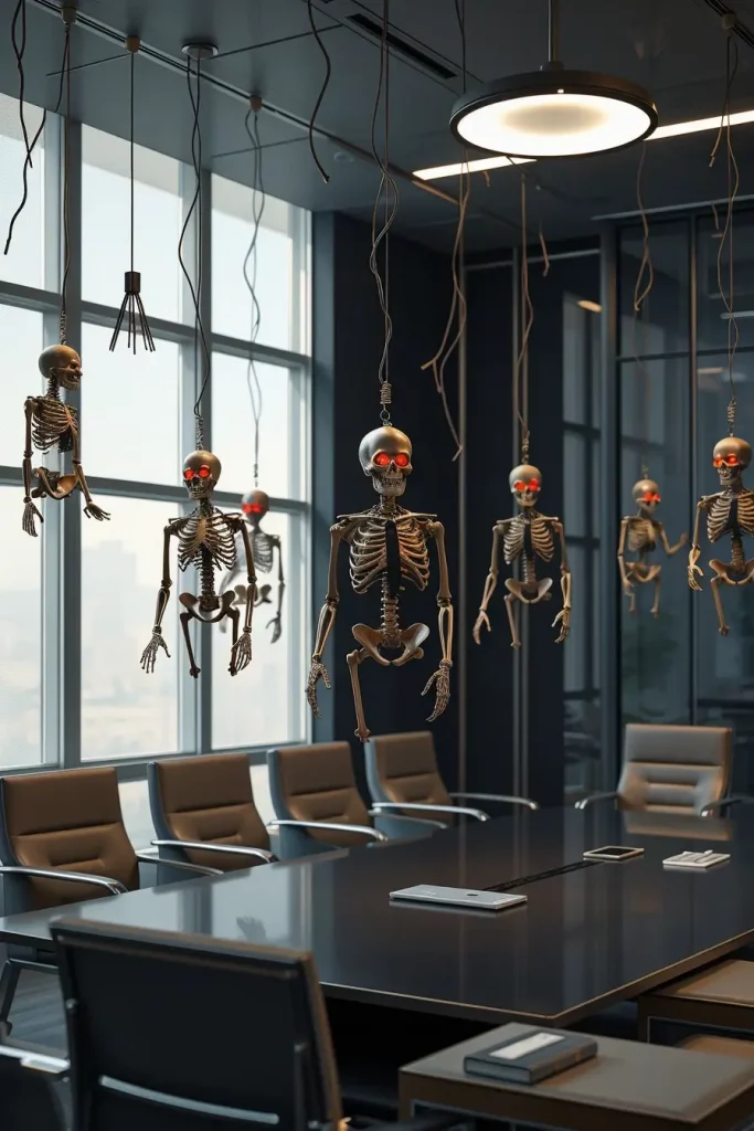 These skeletons may be suspended using transparent wire and put on in business suits or office uniforms to fit into your theme. I’ve also added mini name badges or funny job titles (“Senior Bone Analyst”) to each one for a comedic yet eerie vibe. Red lights in their eye sockets are battery-powered and do not interfere with the lighting balance of the room.