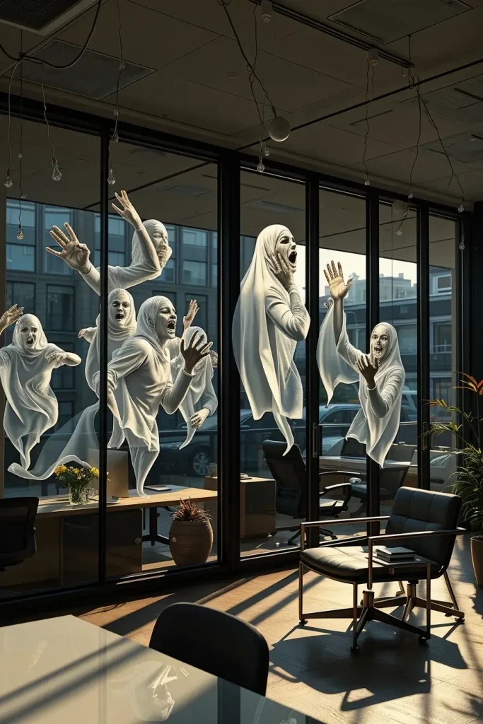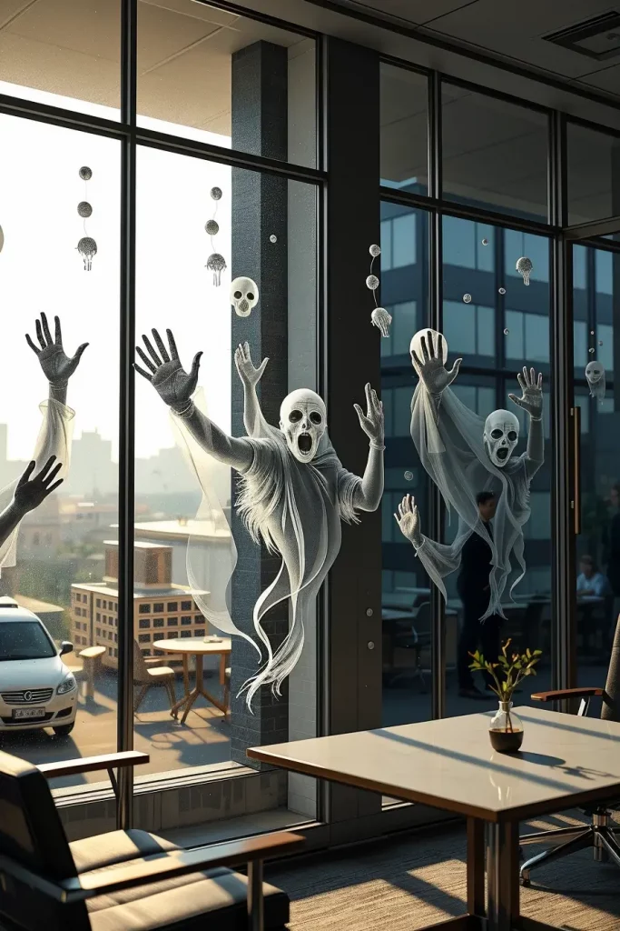 Windows are a part of the background, but in 2025, 3D window clings are a cost-effective and very effective method of spookifying your office. I prefer to select the translucent vinyl images of screaming faces, ghostly silhouettes or hands pushing on the other side. These are great on windows that face the street or inside glass partitions between departments.