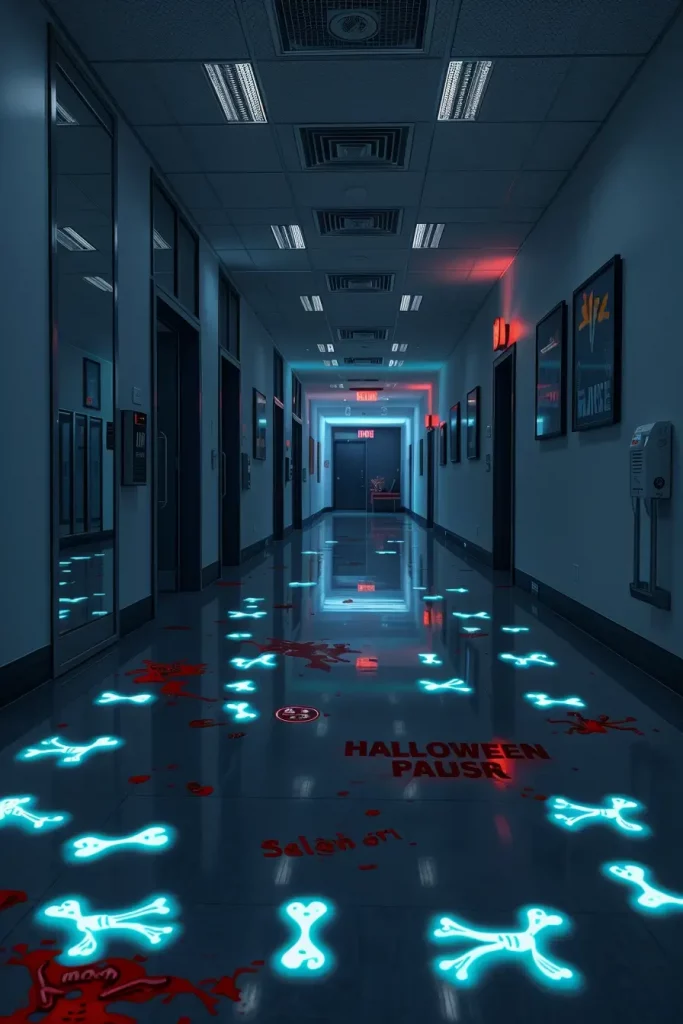Glow-in-the-dark floor decals are one of the simplest, but most efficient ways to make creepy pathways around your work place. I think they are particularly useful in directing the foot traffic when I have Halloween-themed office parties or after-hours parties. These decals may include bloody footprints, skeletal remains or even demonic sigils that can be seen under UV or dim lightings. They are ideal in corridors, break rooms and around lifts.