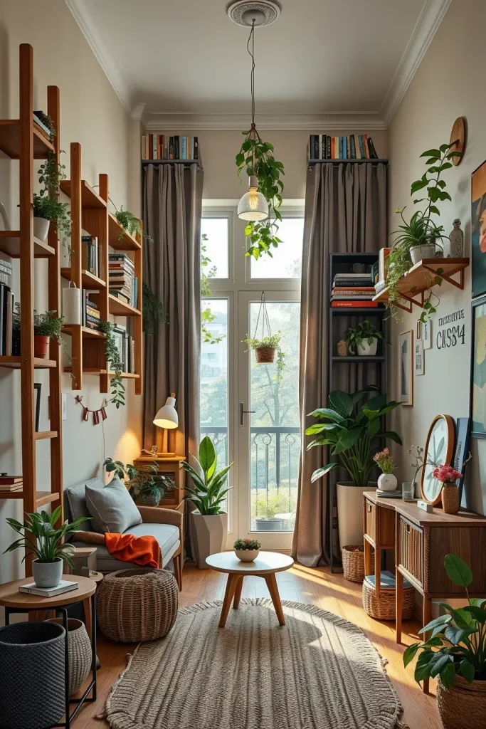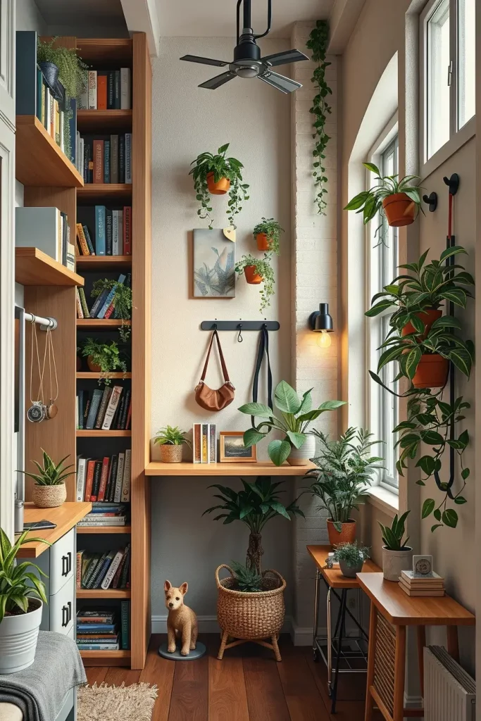 I have a few favorite tricks such as tall bookcases, ladder-style shelves, and hanging hooks such as bikes or kitchen utensils. Vertical gardens can also make a small apartment alive and save space.