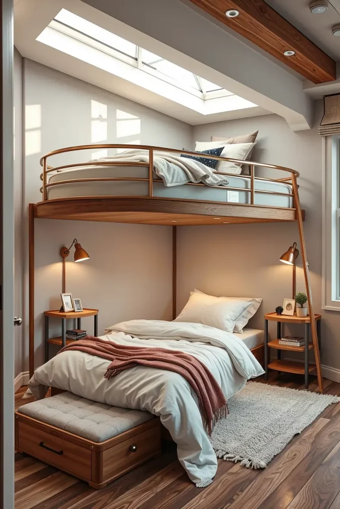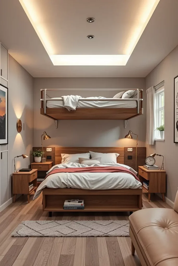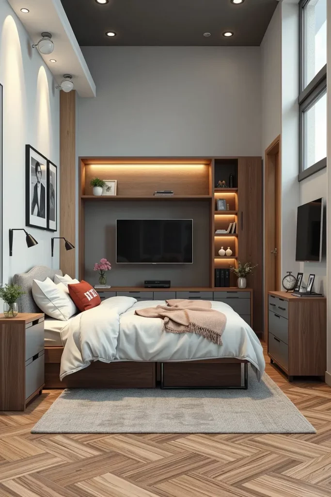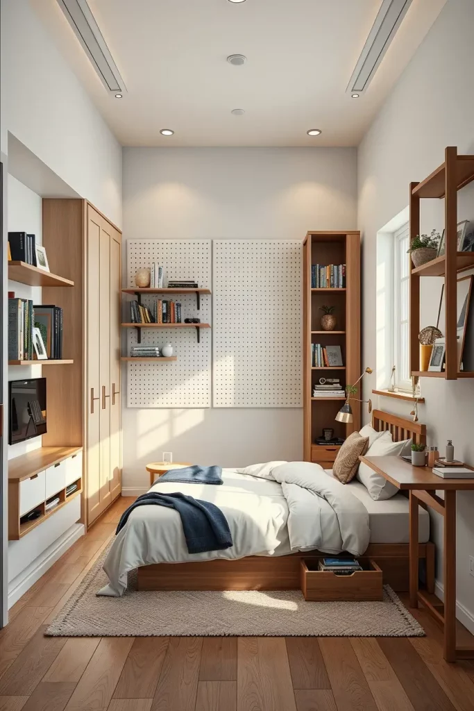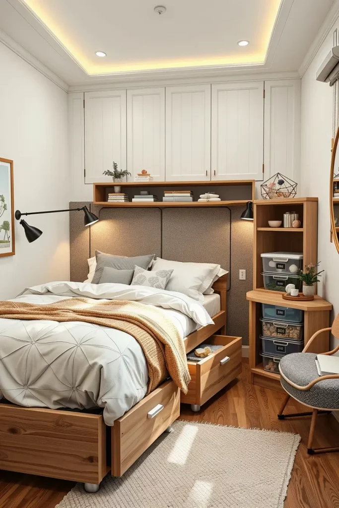 The major components that I employ are slender nightstands, wall-mounted lamps, and under-bed drawers. Another clever storage maximization solution that does not increase the size is a headboard with shelves.