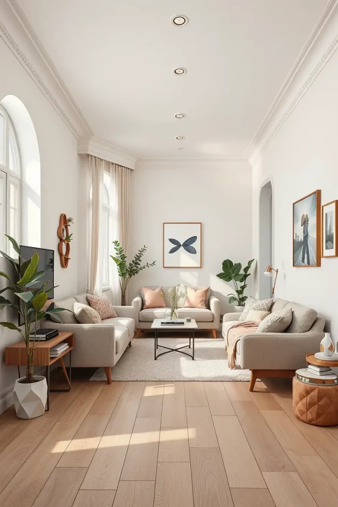 As an example, I usually combine white walls with light oak flooring and beige soft furniture. Pastel cushions or rugs are used as accents, which do not overpower the space. Neutral colors also give the ideal background to art and decor.