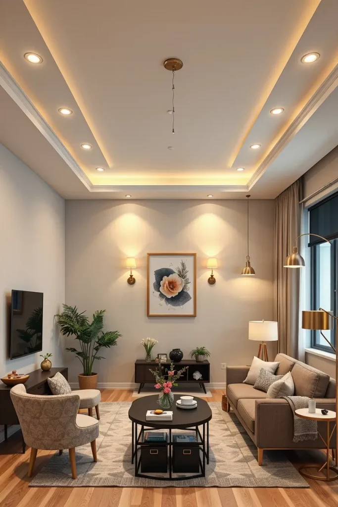 Recessed lighting or track lights are suitable to small living rooms because they do not occupy floor or table space. Clear shades on pendant lights do not overlight kitchens. Soft LED strips are used behind headboards in bedrooms to provide a warm effect.