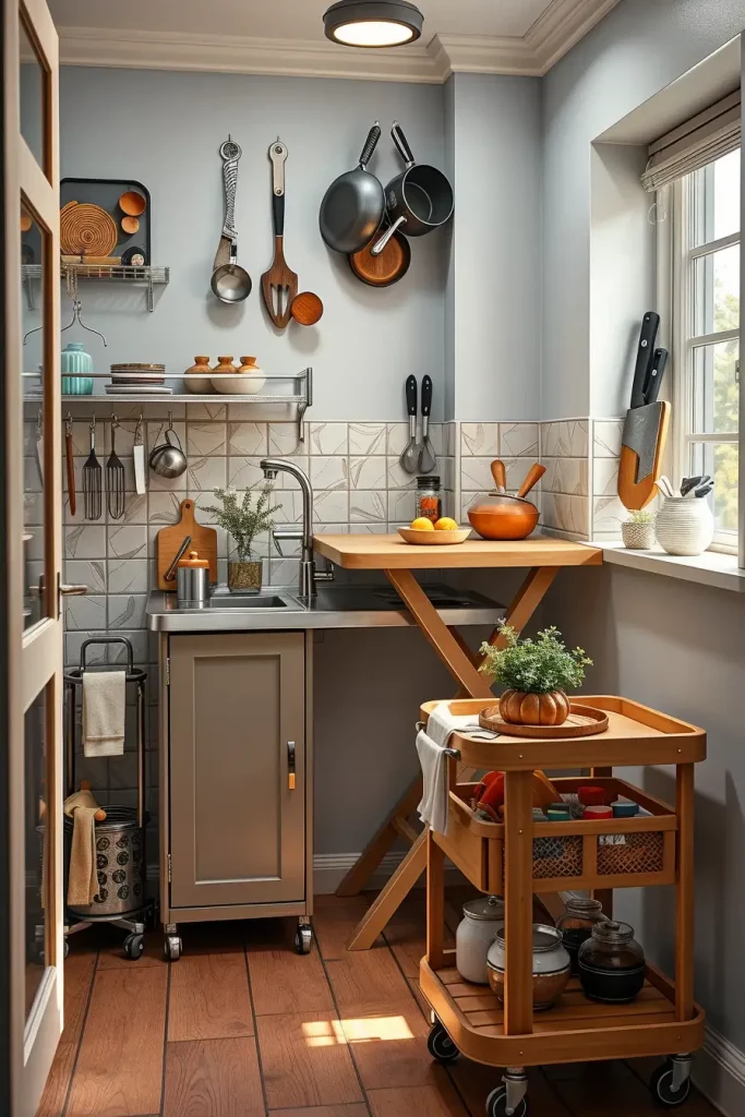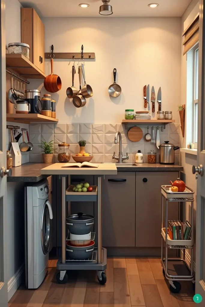 Among the concepts that I like most are magnetic knife strips, rather than large blocks, pot racks mounted on the wall, and folding kitchen tables. Narrow rolling carts also offer additional storage and can be stashed away when not in use.